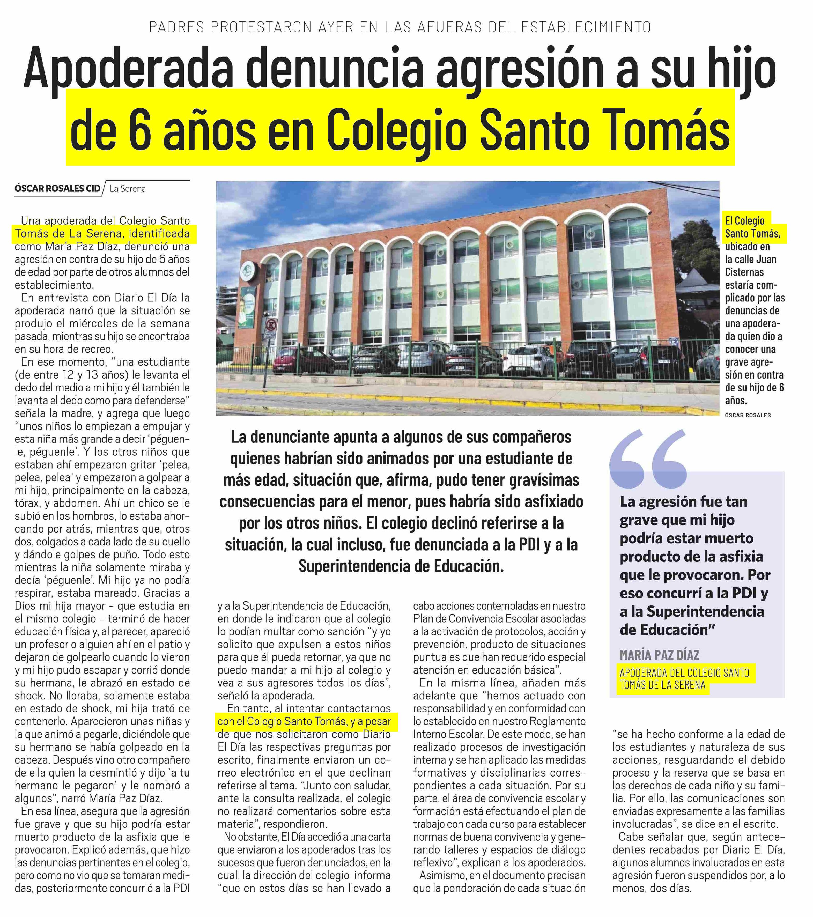 | Título: | Apoderada denuncia agresión a su hijo de 6 años en Colegio Santo Tomás |