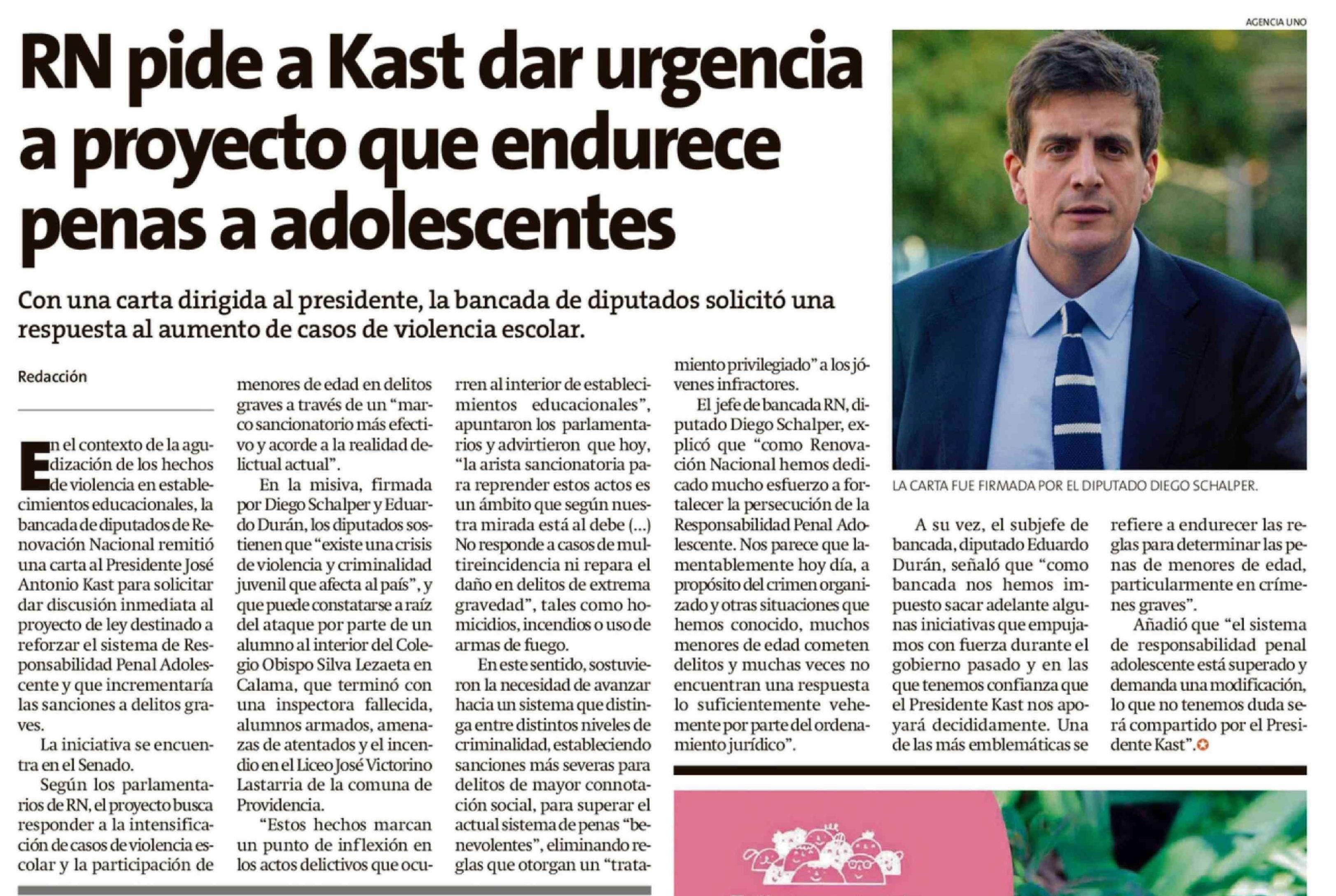 | Título: | RN pide a Kast dar urgencia a proyecto que endurece penas a adolescentes |