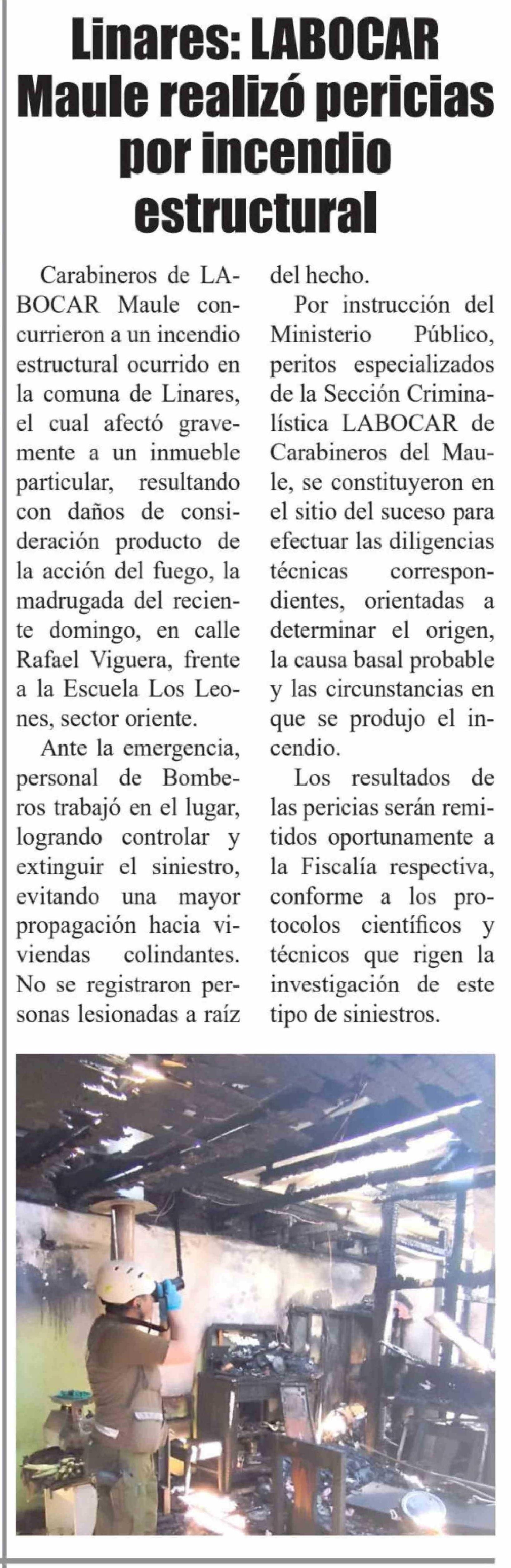 Linares: LABOCAR Maule realizó pericias por incendio estructural 11-02-2026 El Heraldo |
