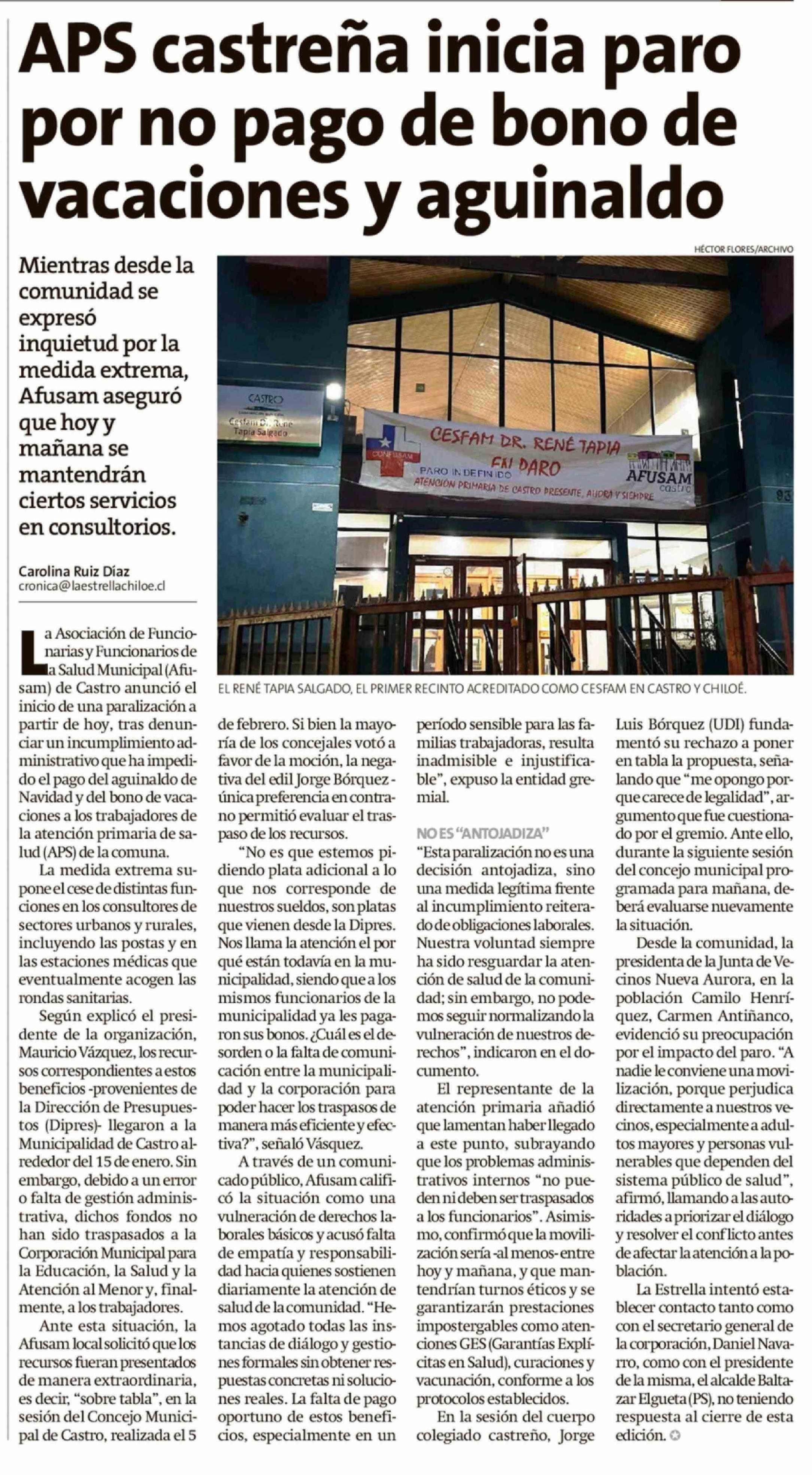 APS castreña inicia paro por no pago de bono de vacaciones y aguinaldo 09-02-2026 La Estrella de Chiloé |