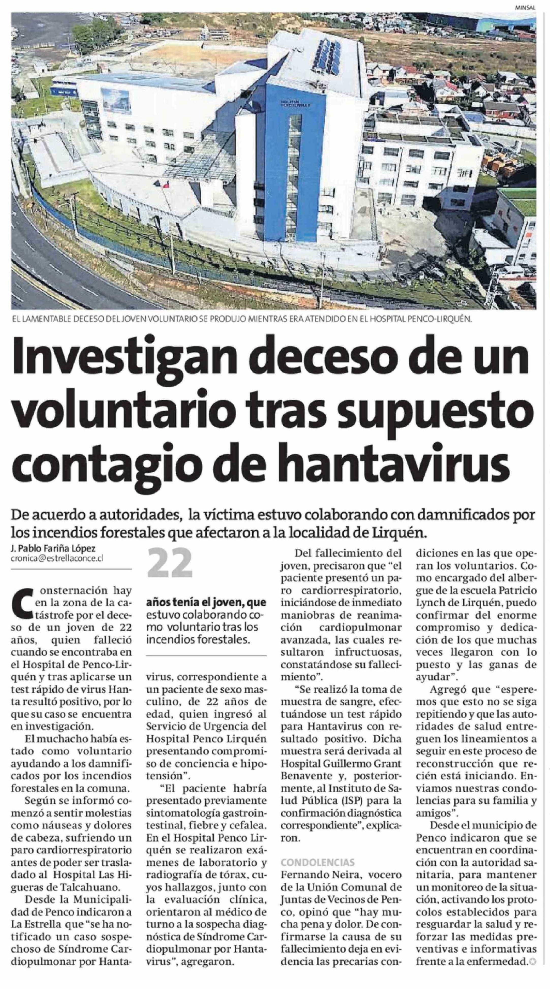 Investigan deceso de un voluntario tras supuesto contagio de hantavirus 09-02-2026 La Estrella de Concepción |