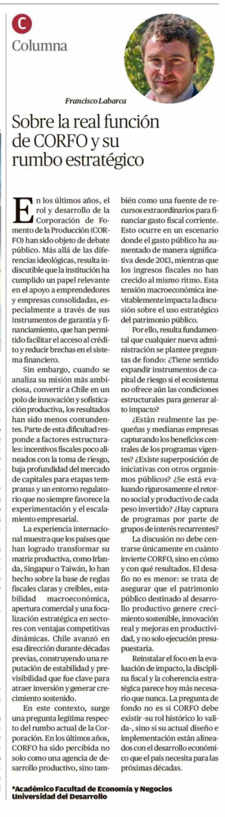 | Título: | Columnas de Opinión: Sobre la real función de CORFO y su rumbo estratégico |