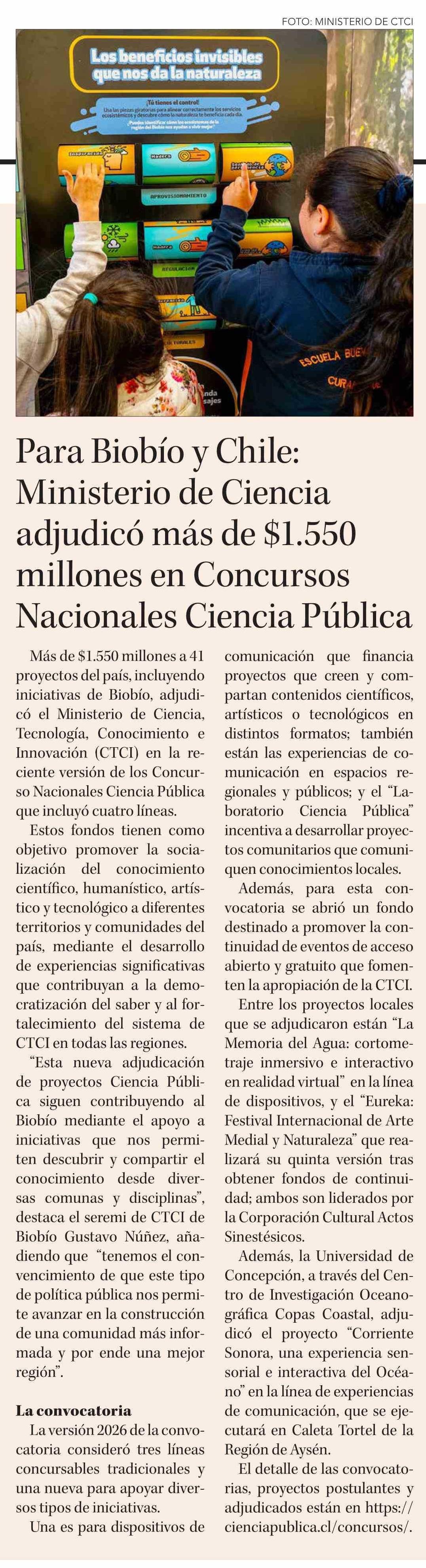 Para Biobío y Chile: Ministerio de Ciencia adjudicó más de $1.550 millones en Concursos Nacionales Ciencia Pública 09-01-2026 Diario Concepción |