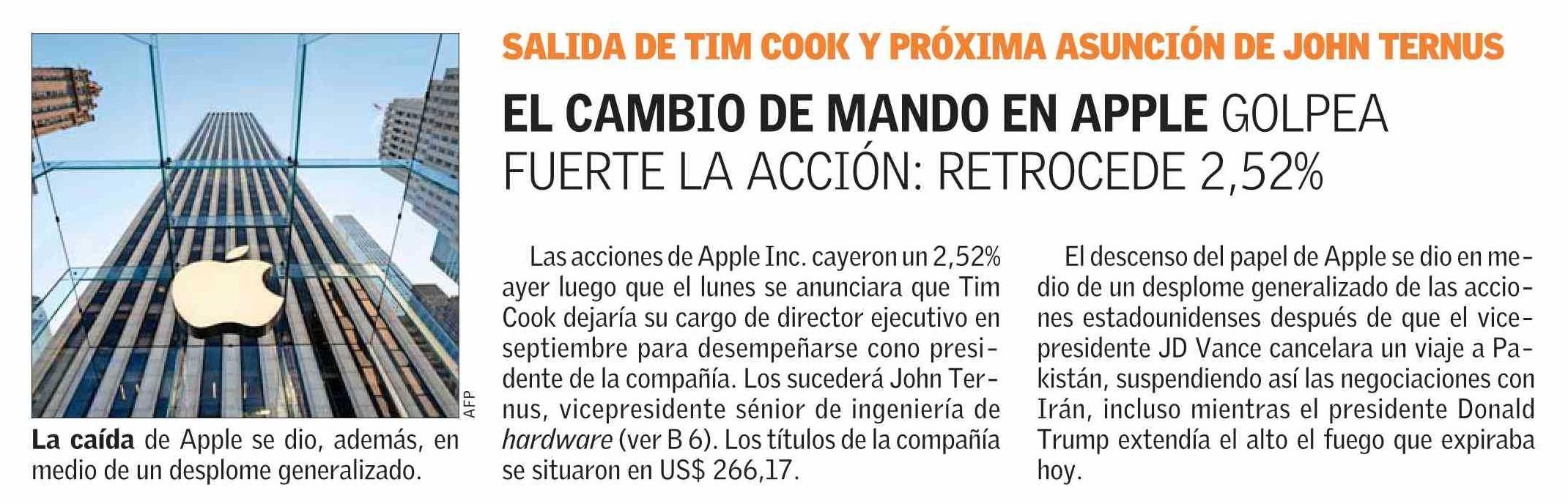 EL CAMBIO DE MANDO EN APPLE GOLPEA FUERTE LA ACCIÓN: RETROCEDE 2,52% 22-04-2026 El Mercurio |