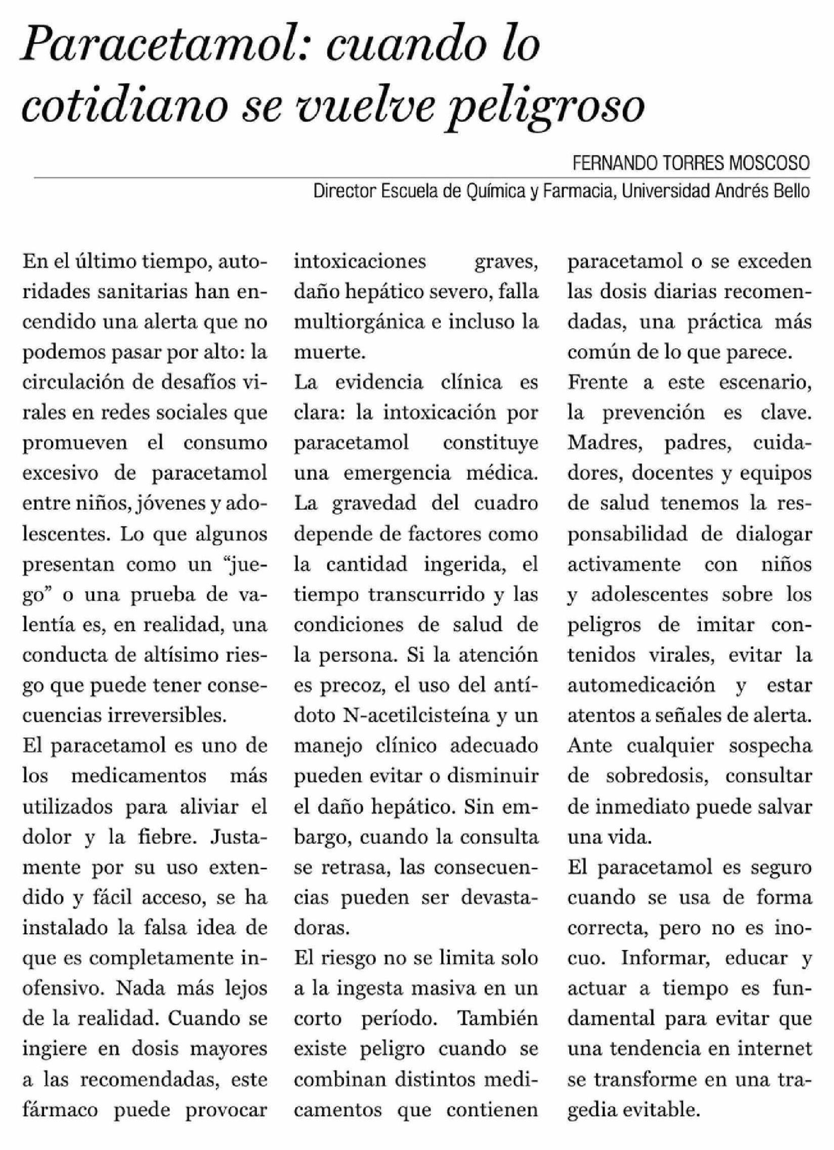 Título: Columnas de Opinión: Paracetamol: cuando lo cotidiano se vuelve peligroso
