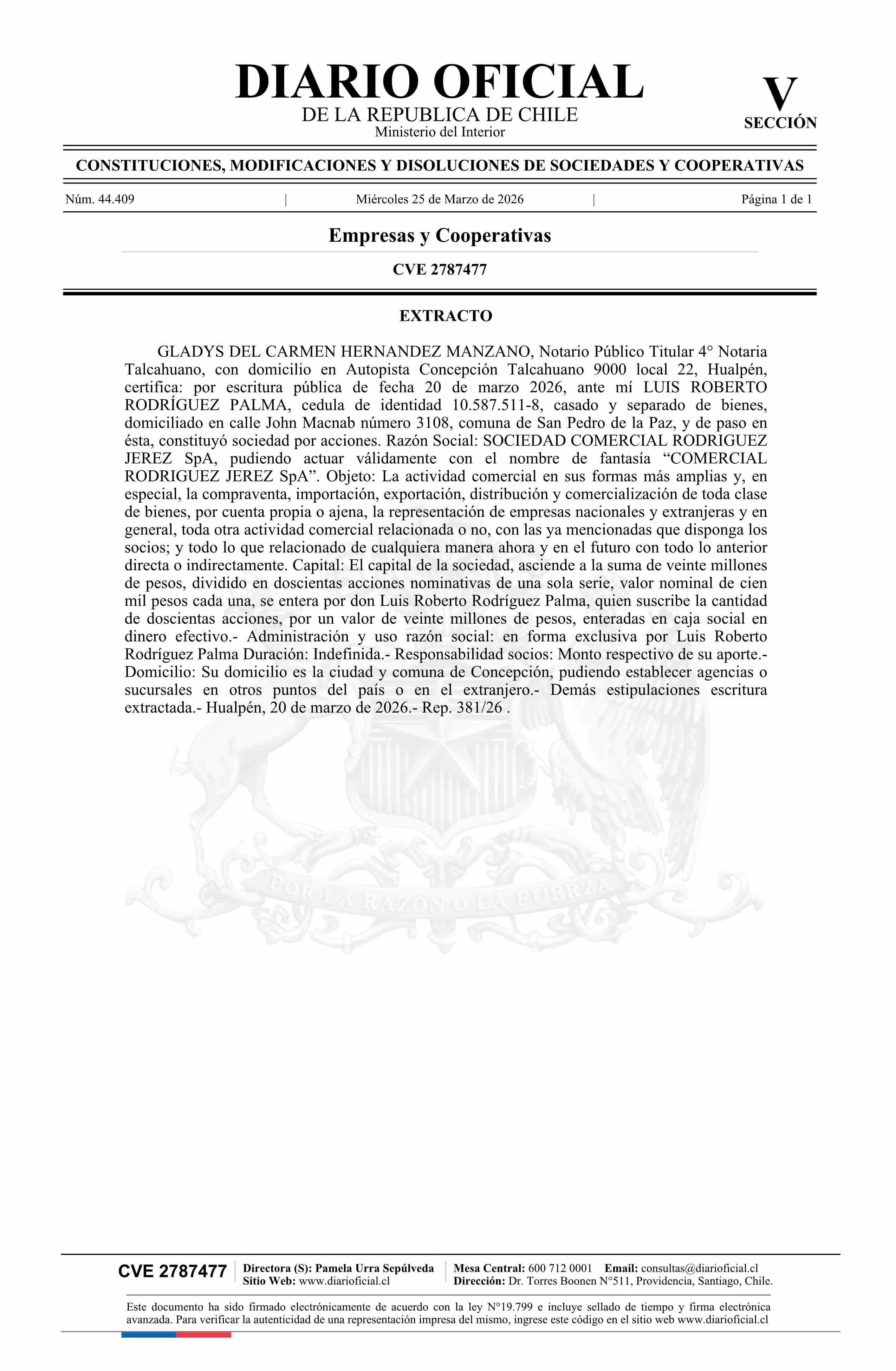 SOCIEDAD COMERCIAL RODRIGUEZ JEREZ SpA 25-03-2026 Diario Oficial Edición Electrónica |