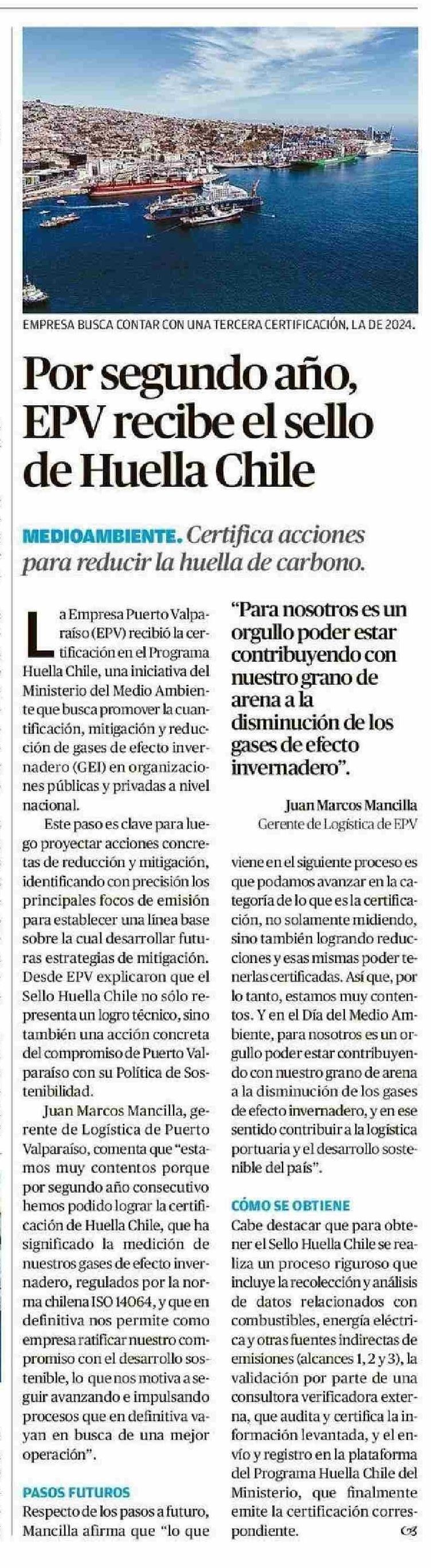 Por segun de Huella Chile EPV recibe el sello do año, 06-06-2025 El Mercurio de Valparaíso |