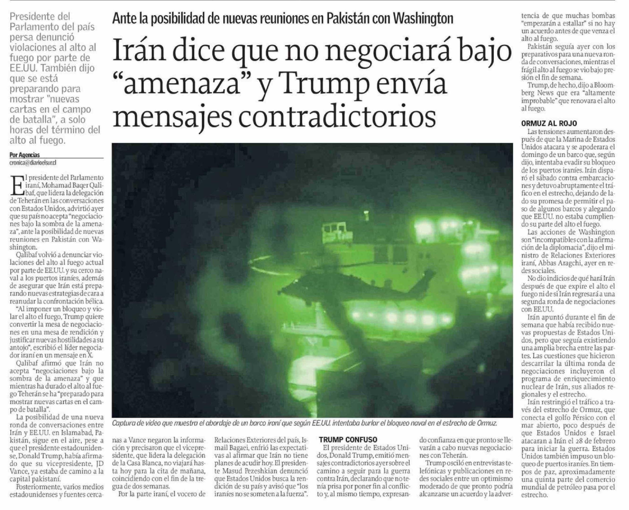 Irán dice que no negociará bajo "amenaza" y Trump envía mensajes contradictorios 21-04-2026 El Sur |