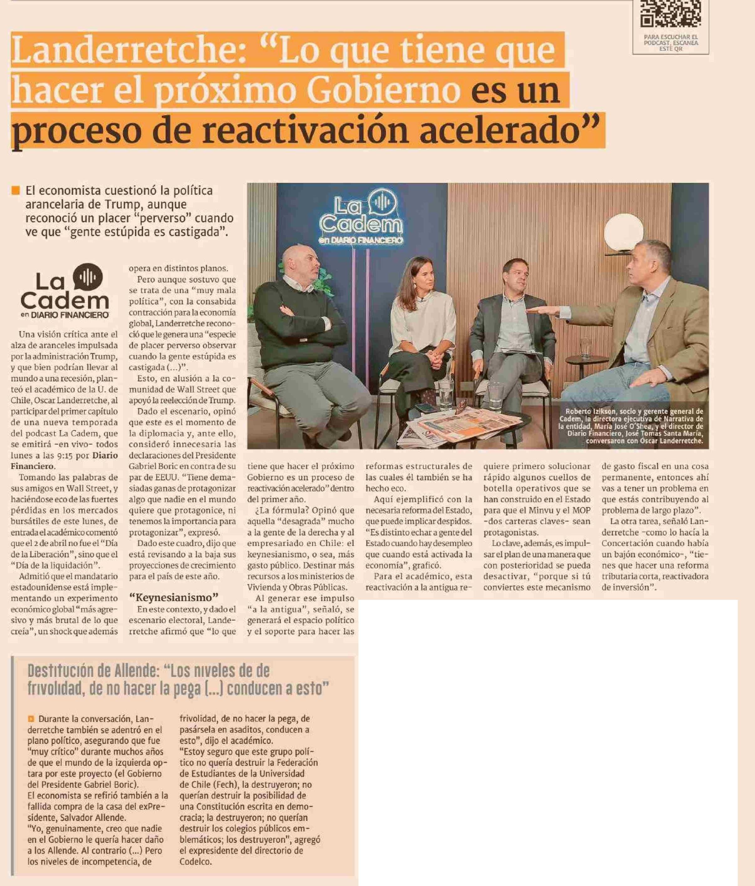 Landerretche: Lo que tiene que hacer el próximo Gobierno es un proceso de reactivación acelerado” 08-04-2025 Diario Financiero |