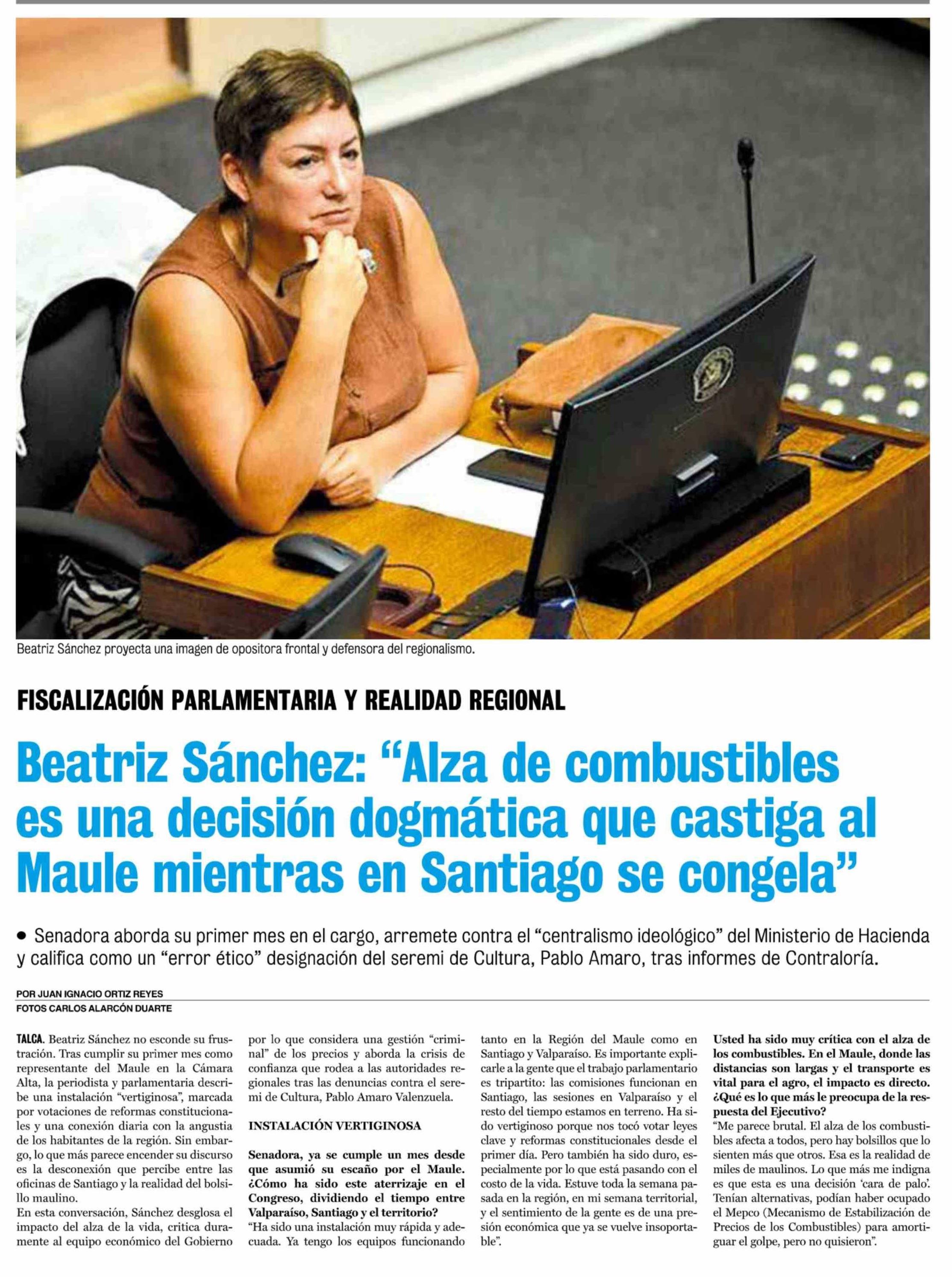 | Título: | Beatriz Sánchez: "Alza de combustibles es una decisión dogmática que castiga al Maule mientras en Santiago se congela" |