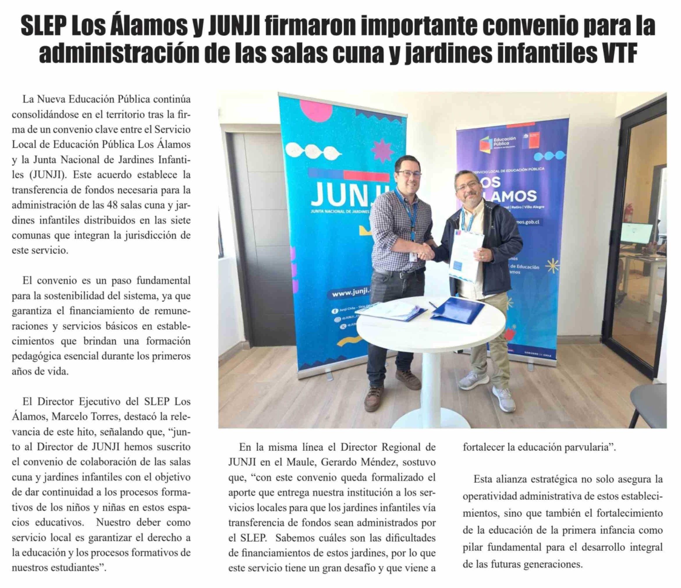 Título: SLEP Los Álamos y JUNJI firmaron importante convenio para la administración de las salas cuna y jardines infantiles VTF