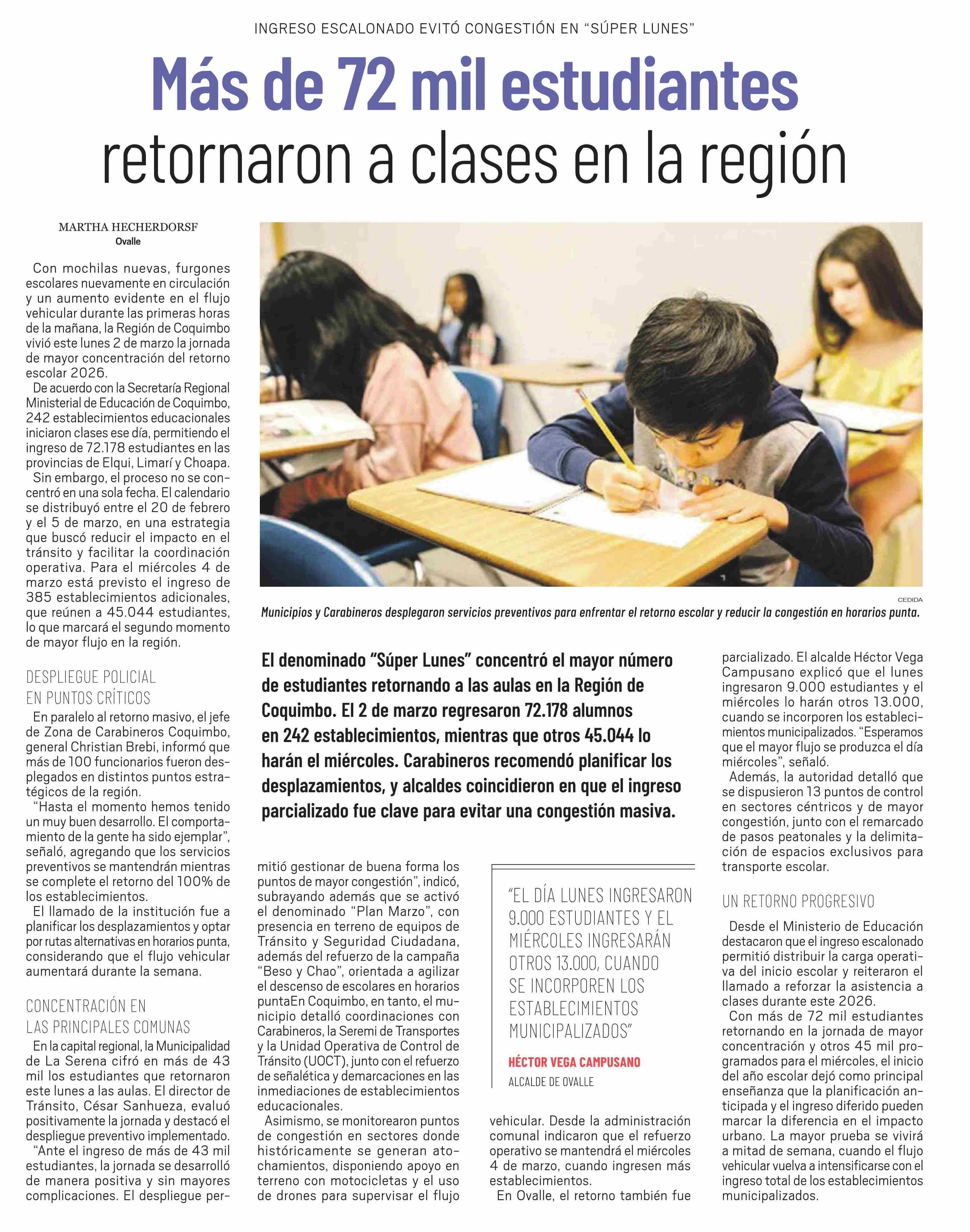 Más de 72 mil estudiantes retornaron a clases en la región 03-03-2026 El Ovallino |