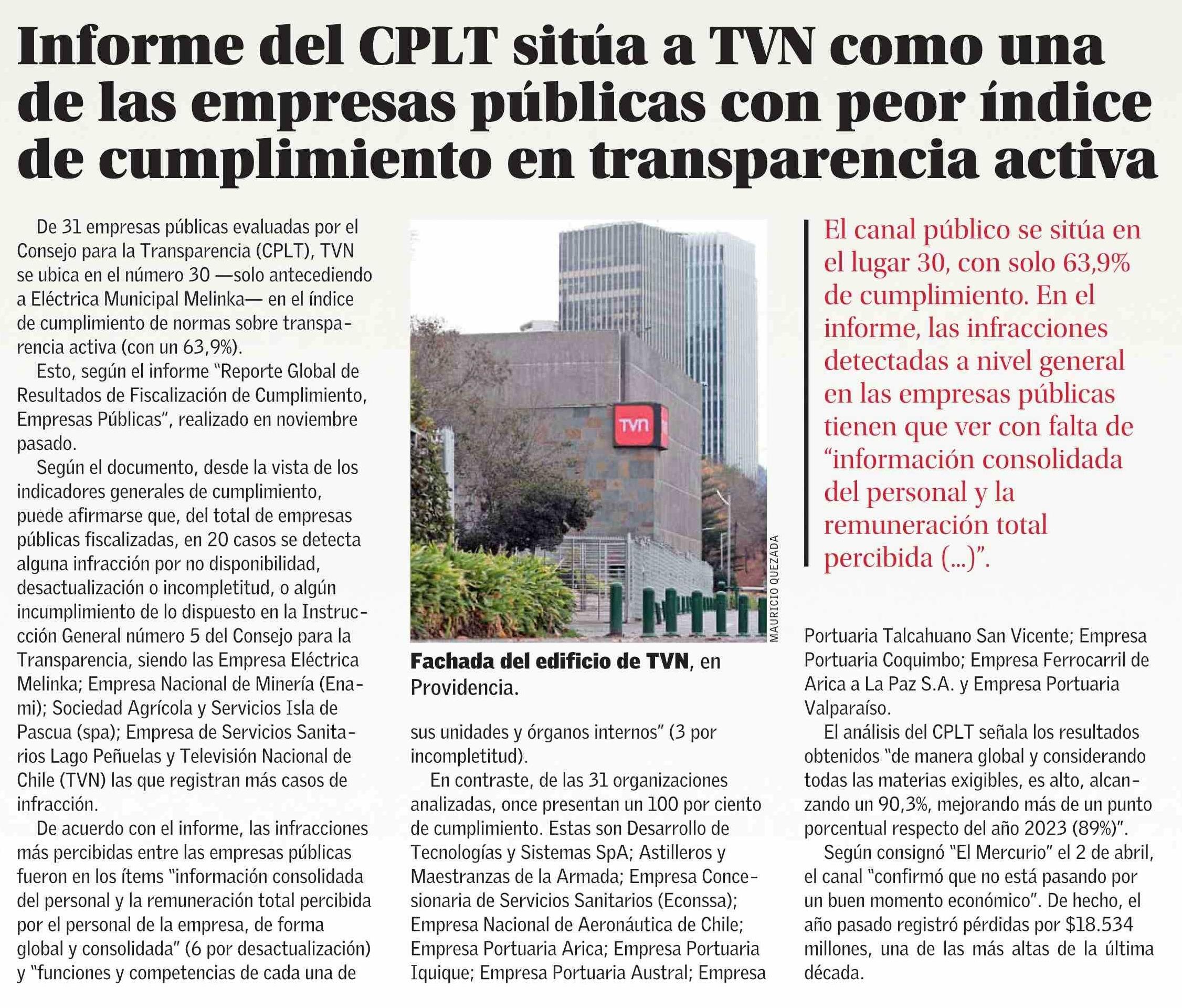 Informe del CPLT sitúa a TVN como una de las empresas públicas con peor índice de cumplimiento en transparencia activa 06-04-2025 El Mercurio |