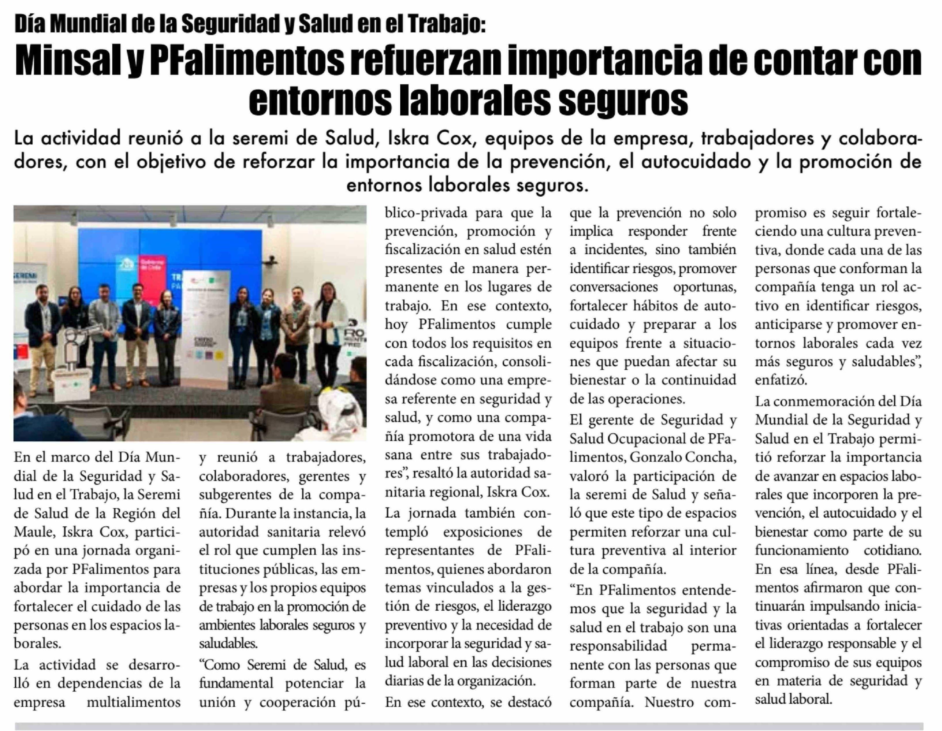 Minsal y PFalimentos refuerzan importancia de contar con entornos laborales seguros 29-04-2026 El Lector |