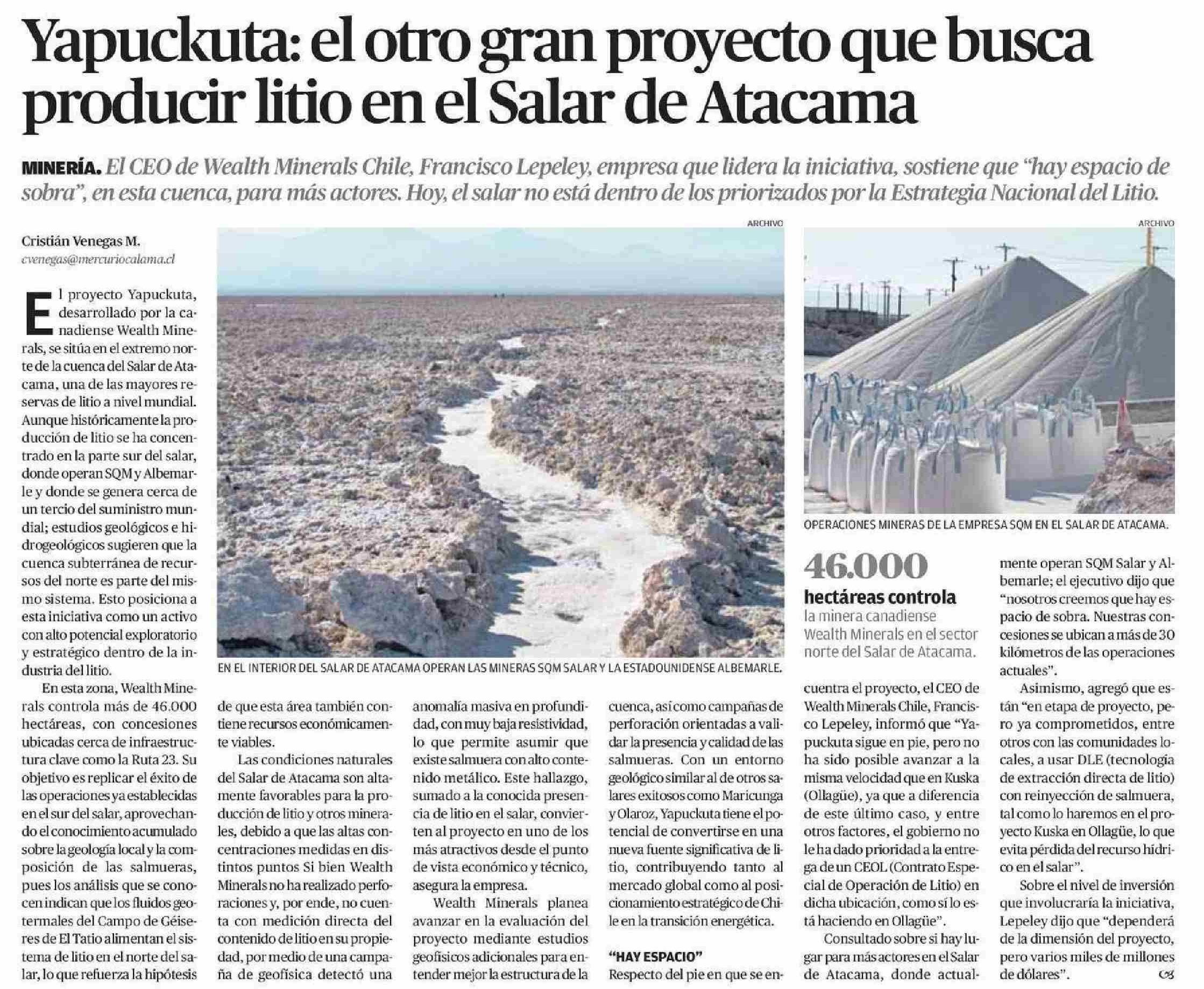 Yapuckuta: el otro gran proyecto que busca producir litio en el Salar de Atacama 04-06-2025 El Mercurio de Calama |