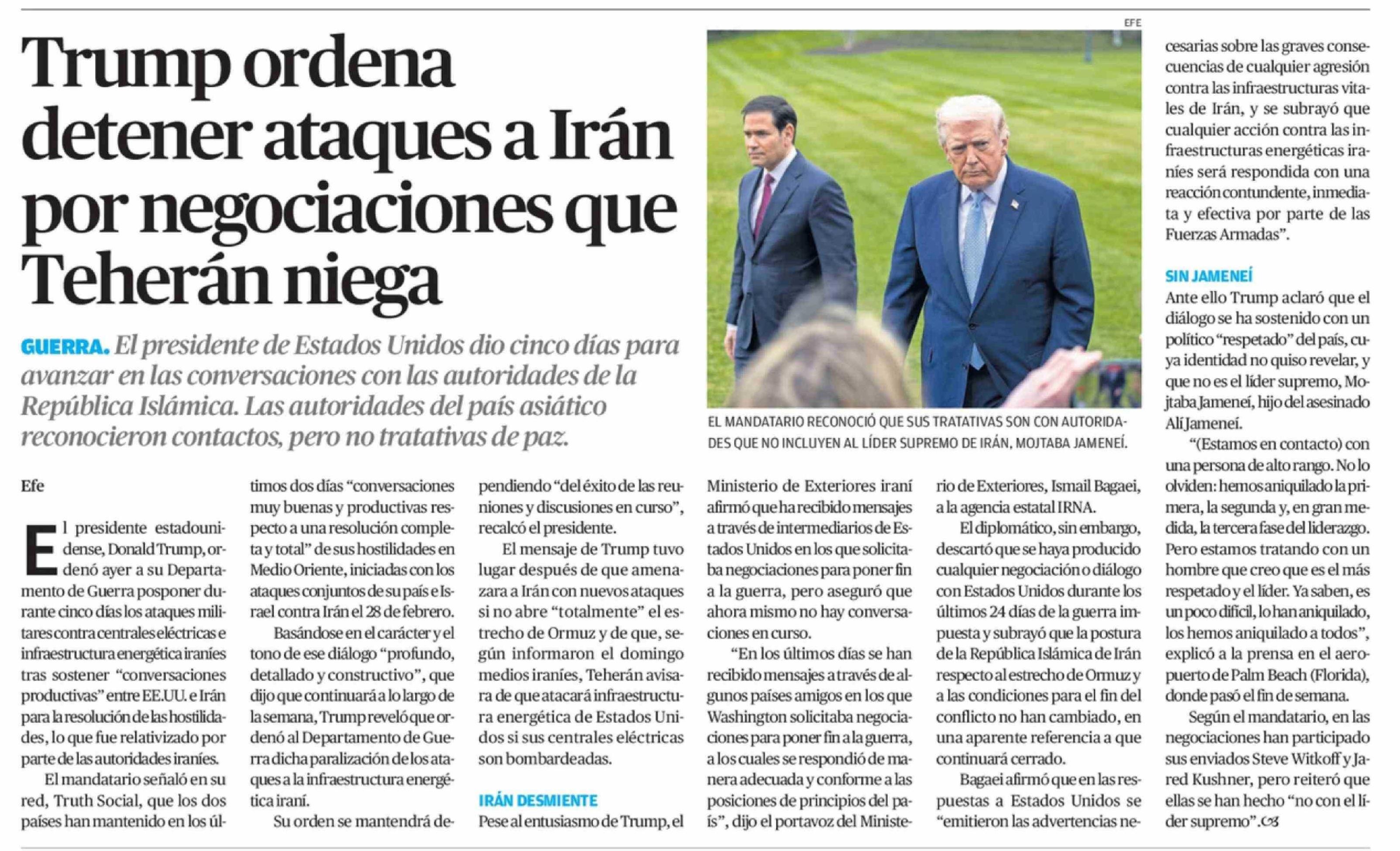 Título: Trump ordena detener ataques a Irán por negociaciones que Teherán niega