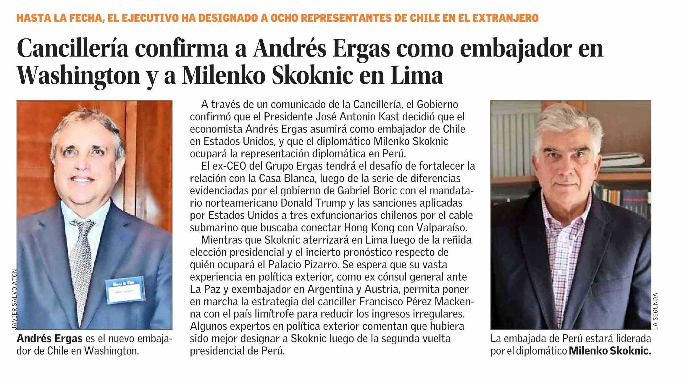 Título: Cancillería confirma a Andrés Ergas como embajador en Washington y a Milenko Skoknic en Lima