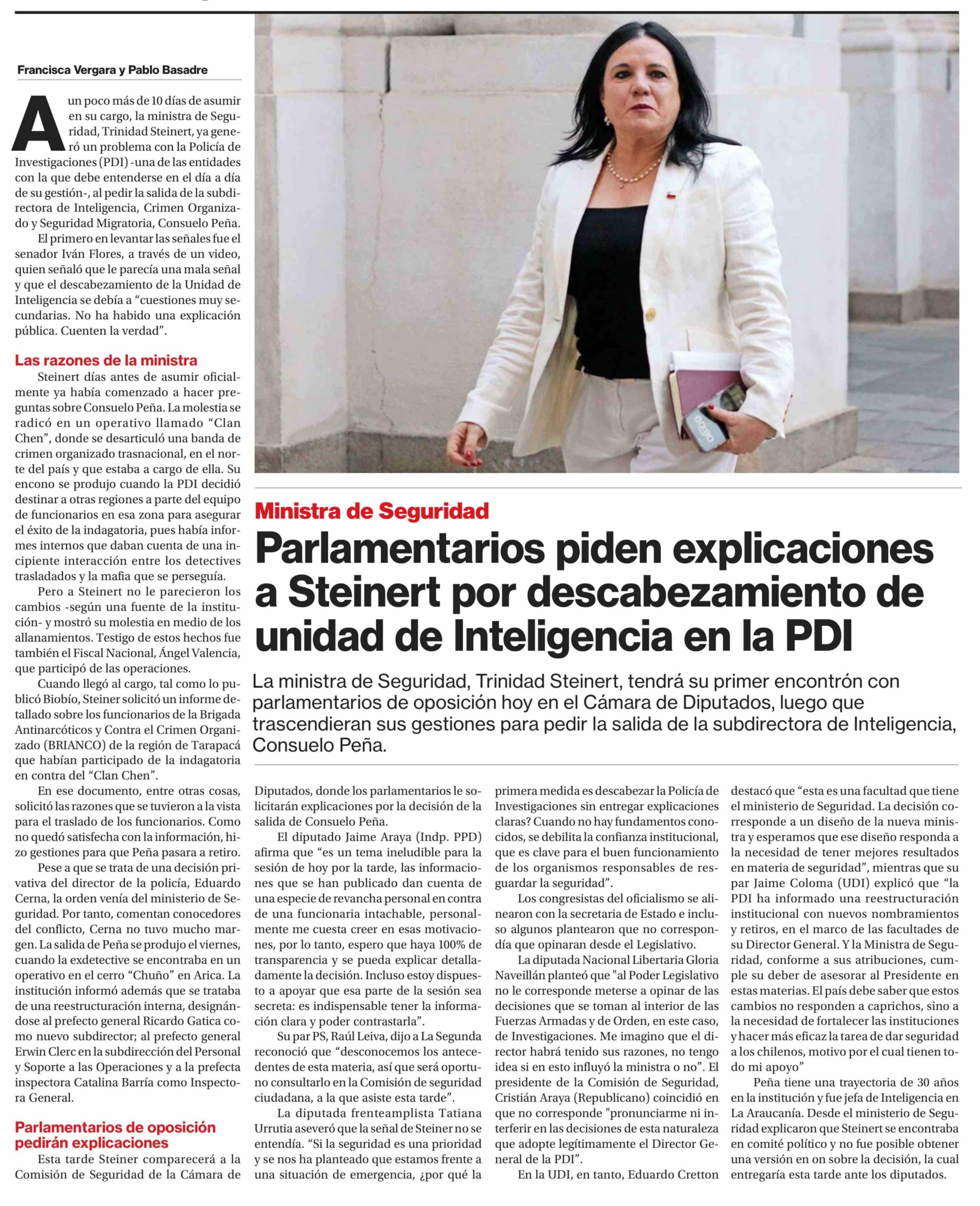 | Título: | Parlamentarios piden explicaciones a Steinert por descabezamiento de unidad de Inteligencia en la PDI |