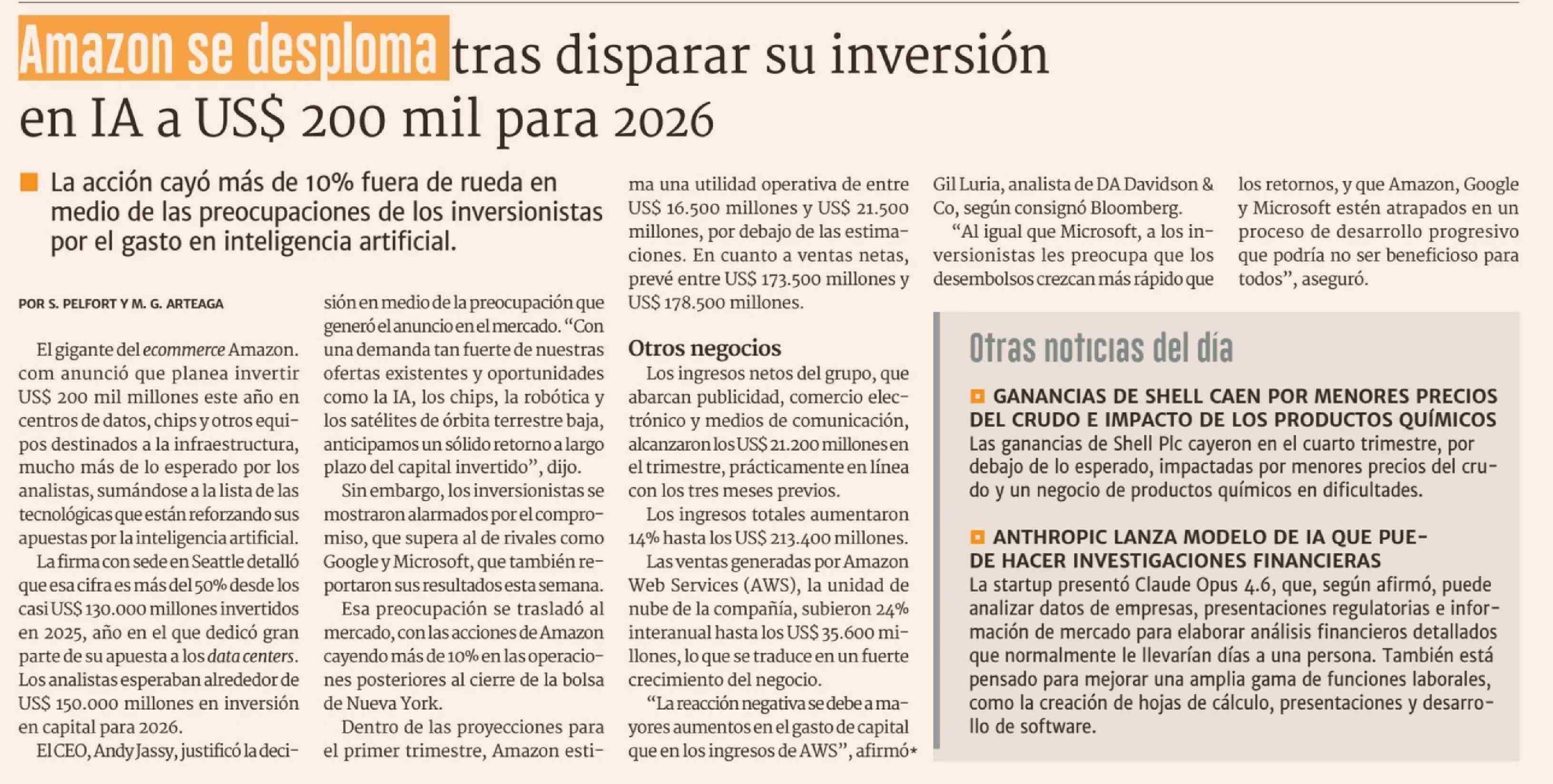 Título: Amazon se desploma tras disparar su inversión en IA a US$ 200 mil para 2026