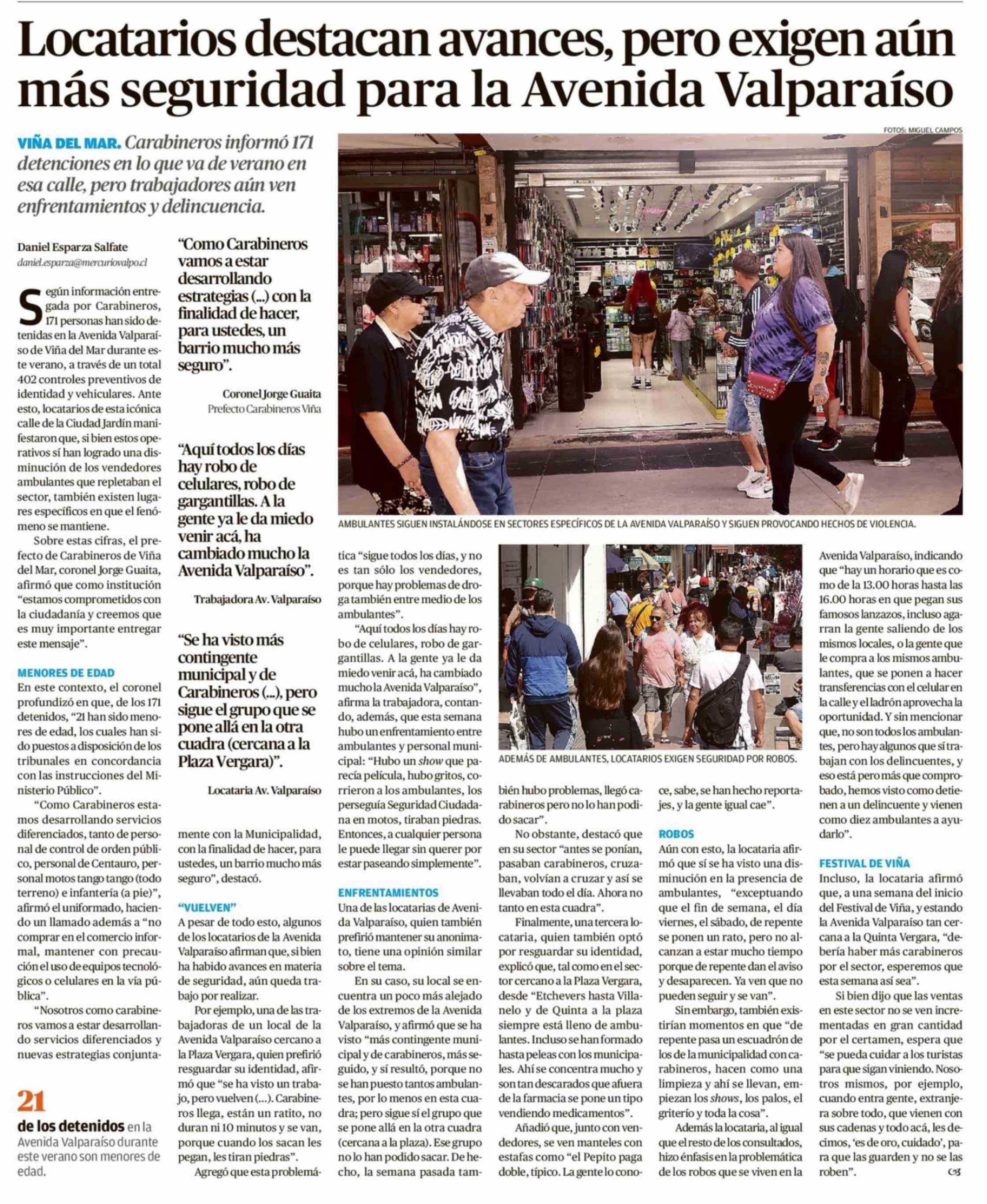 Locatarios destacan avances, pero exigen aún más seguridad para la Avenida Valparaíso 15-02-2026 El Mercurio de Valparaíso |