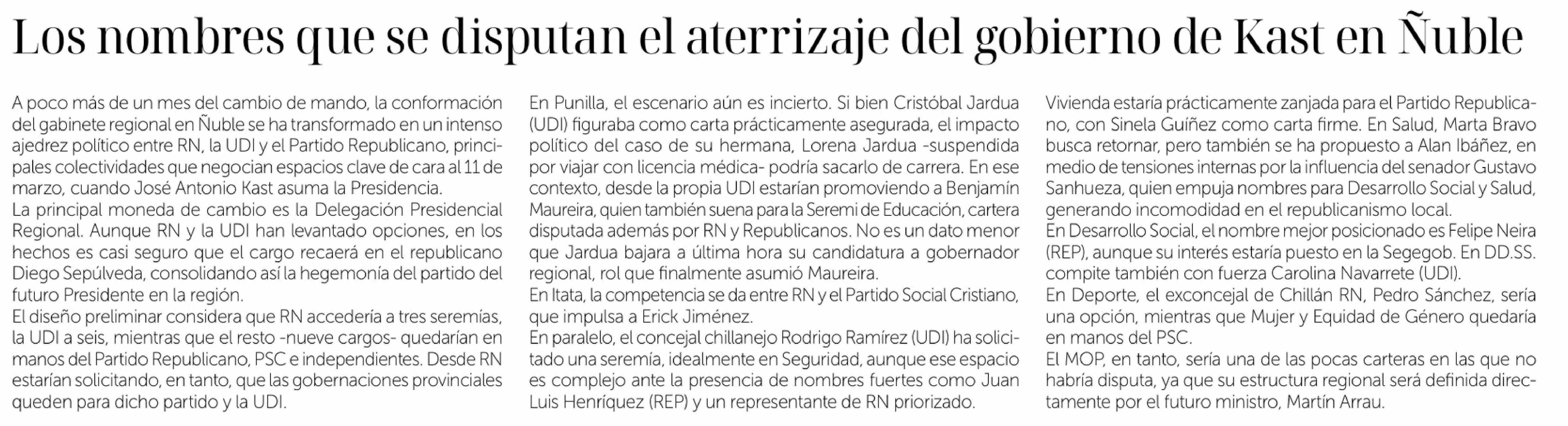 | Título: | Los nombres que se disputan el aterrizaje del gobierno de Kast en Ñuble |