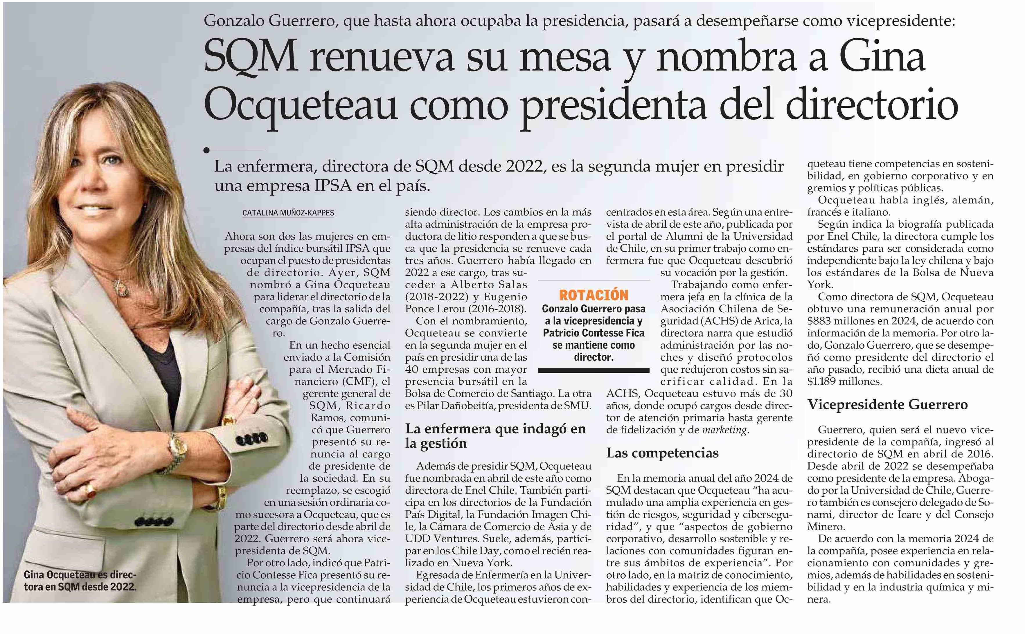 SQM renueva su mesa y nombra a Gina Ocqueteau como presidenta del directorio 28-05-2025 El Mercurio |