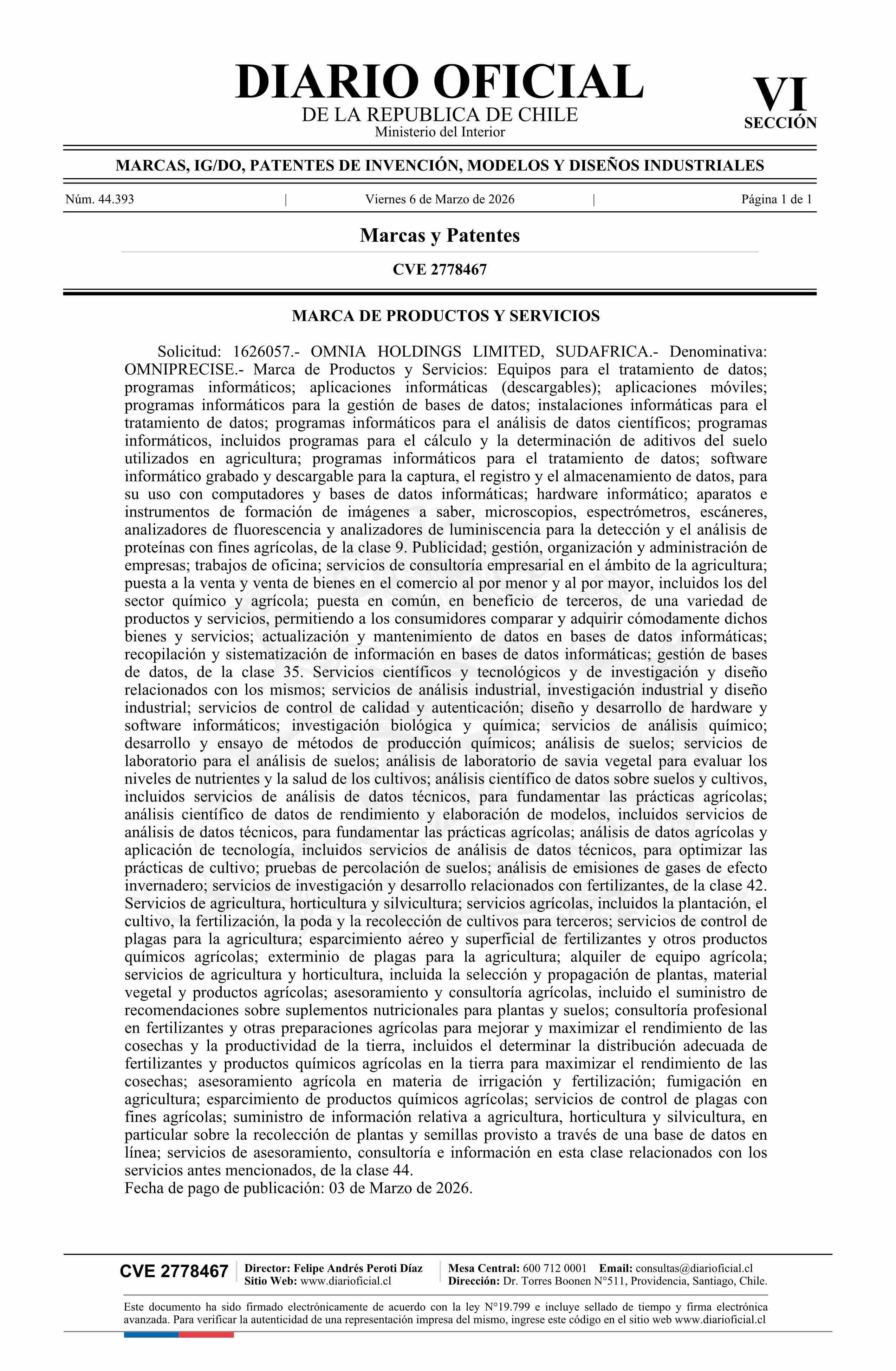 Fuente: Diario Oficial Edición Electrónica (Diario Oficial de Chile - 6 Marcas Y Patentes) Página(s): 1