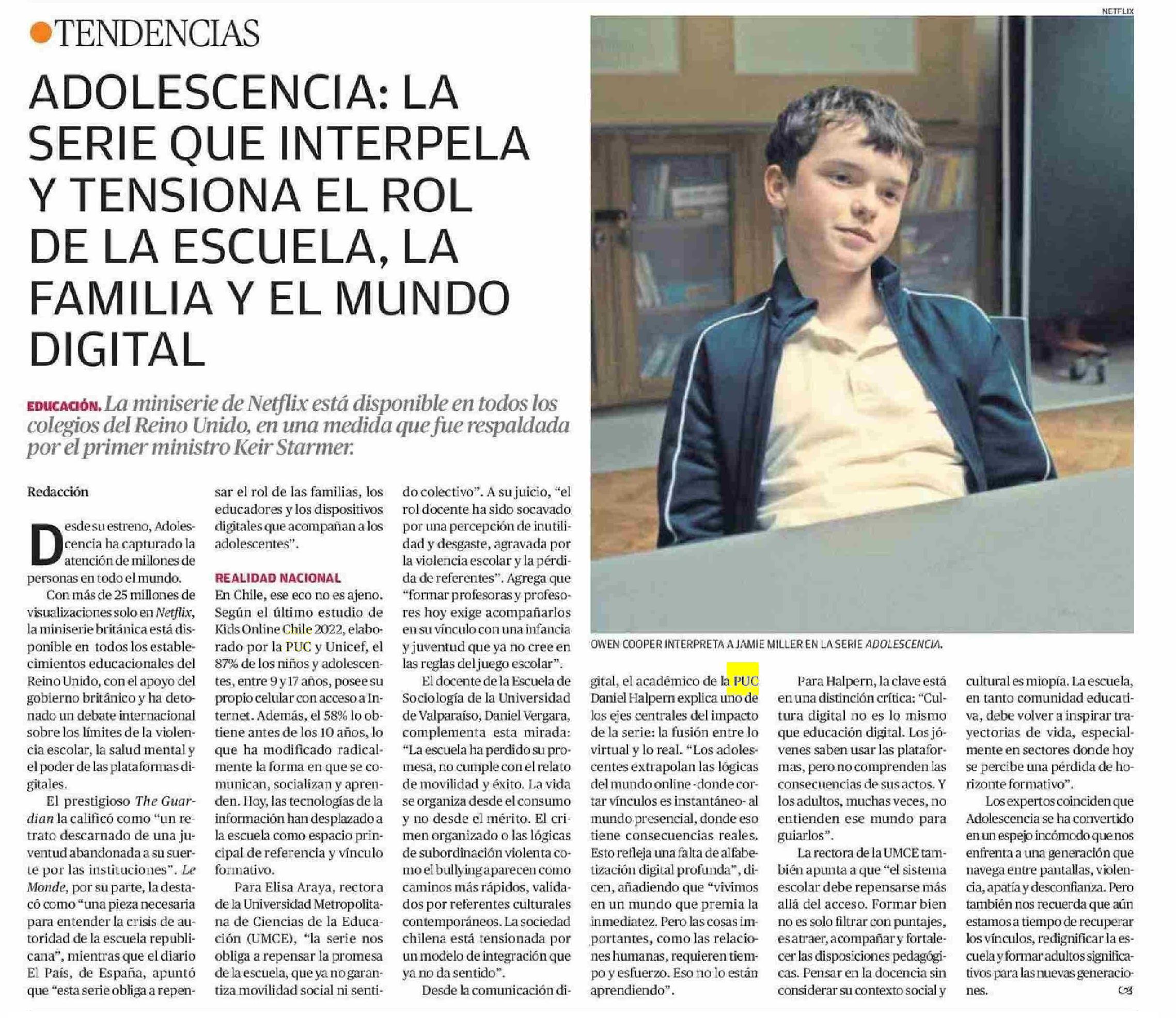 ADOLESCENCIA: LA SERIE QUE INTERPELA Y TENSIONA EL ROL DE LA ESCUELA, LA FAMILIA Y EL MUNDO DIGITAL 20-04-2025 El Mercurio de Calama |