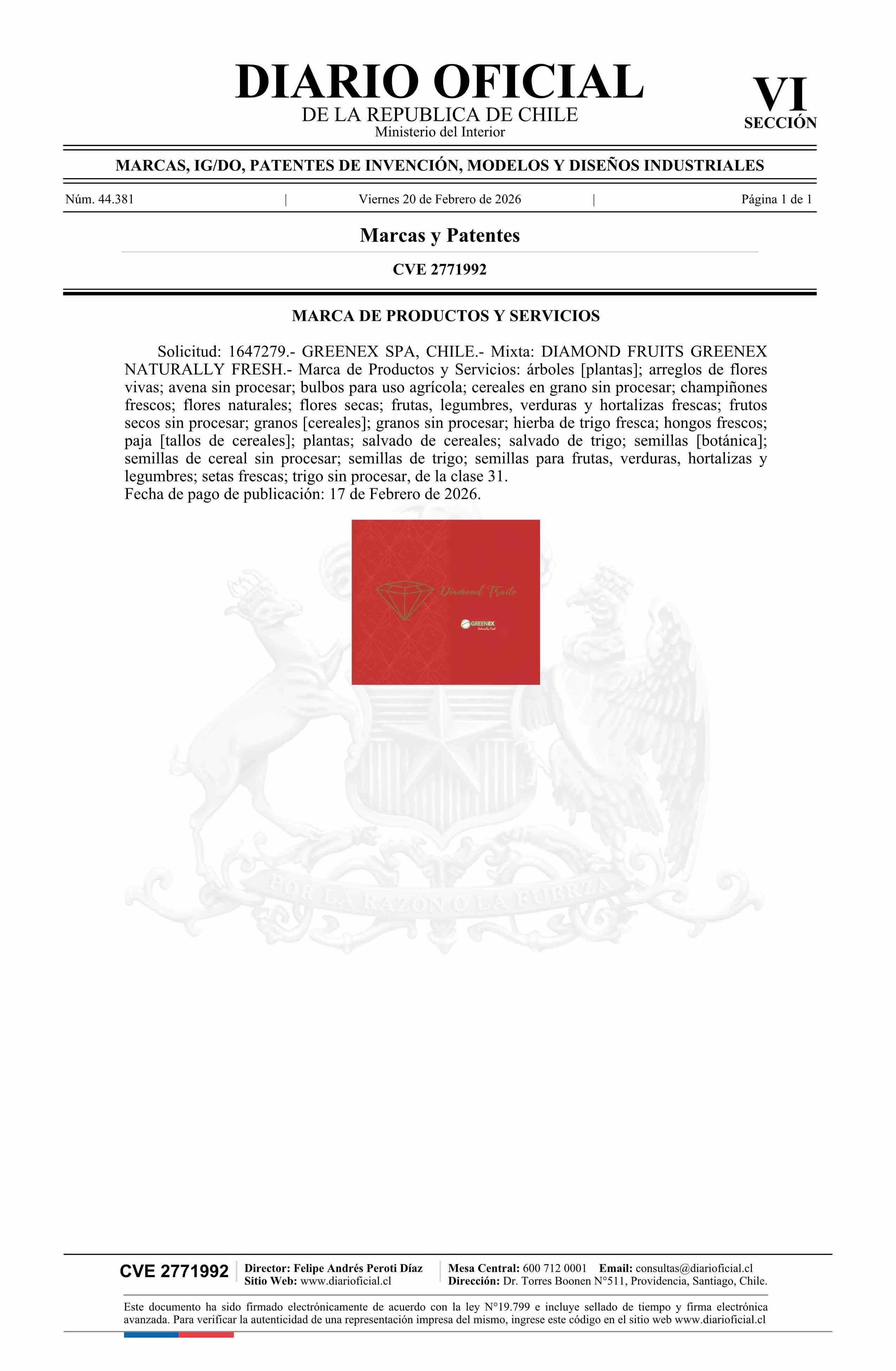 Fuente: Diario Oficial Edición Electrónica (Diario Oficial de Chile - 6 Marcas Y Patentes) Página(s): 153