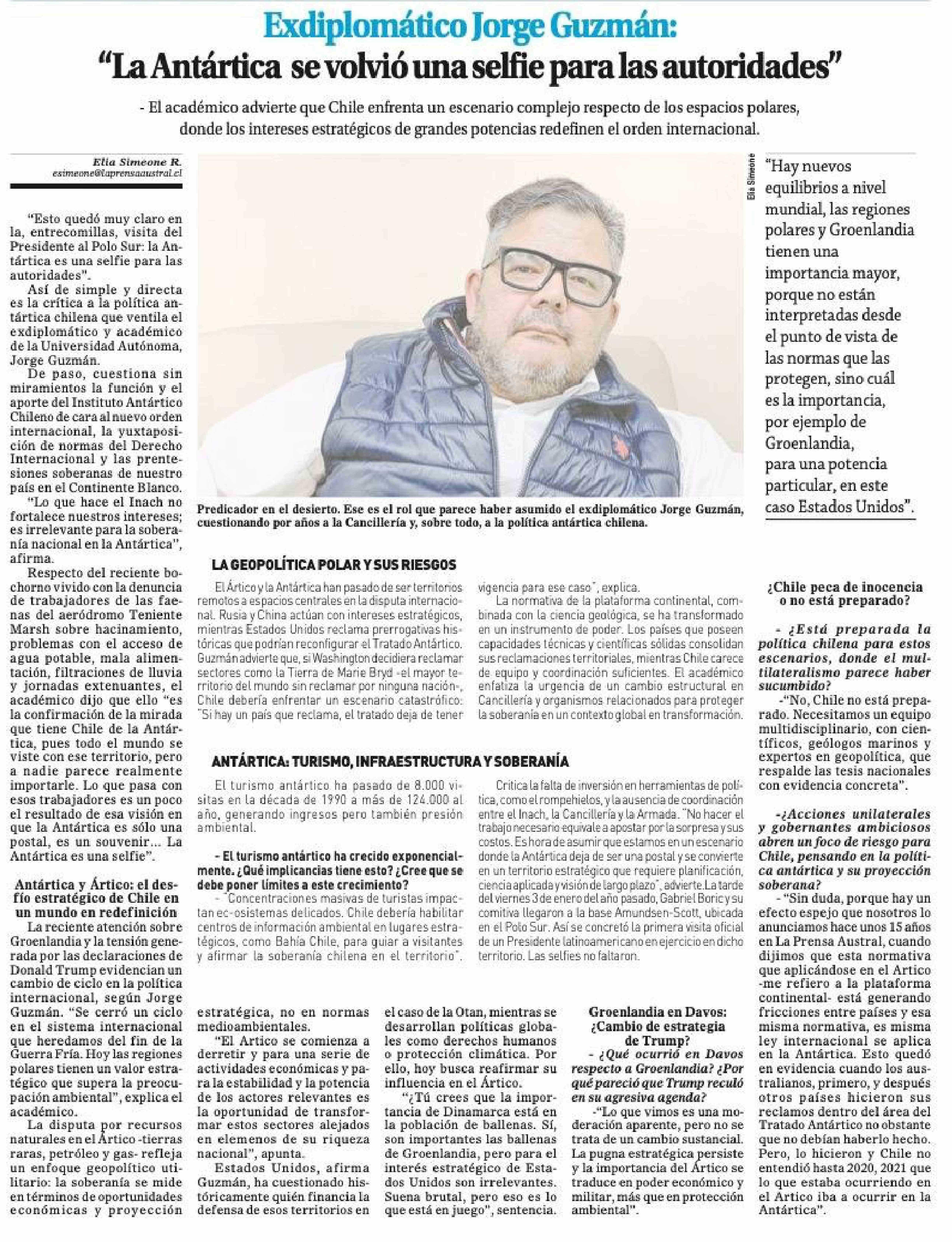 Título: Exdiplomático Jorge Guzmán: "La Antártica se volvió una selfie para las autoridades"