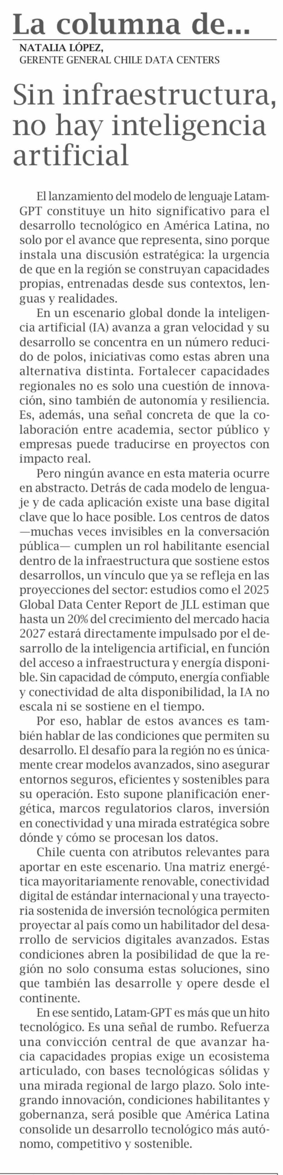 | Título: | Columnas de Opinión: Sin infraestructura, no hay inteligencia artificial |