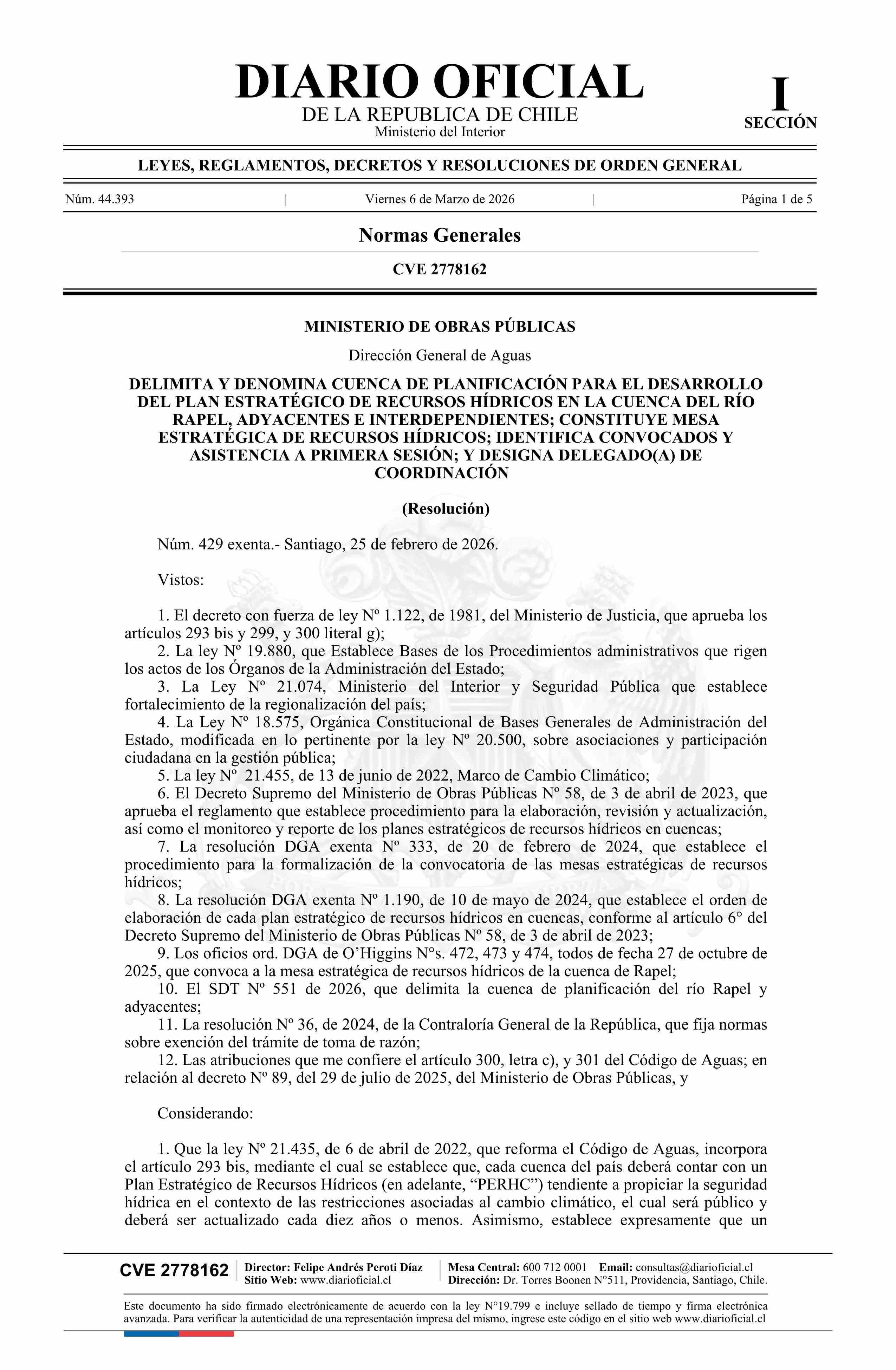 Título: Resolución exenta número 429, de 2026.- Delimita y denomina cuenca de planificación para el desarrollo del Plan Estratégico de Recursos Hídricos en la Cuenca del Río Rapel, Adyacentes e Interdependientes; constituye mesa estratégica de recursos hídricos; identifica convocados y asistencia a primera