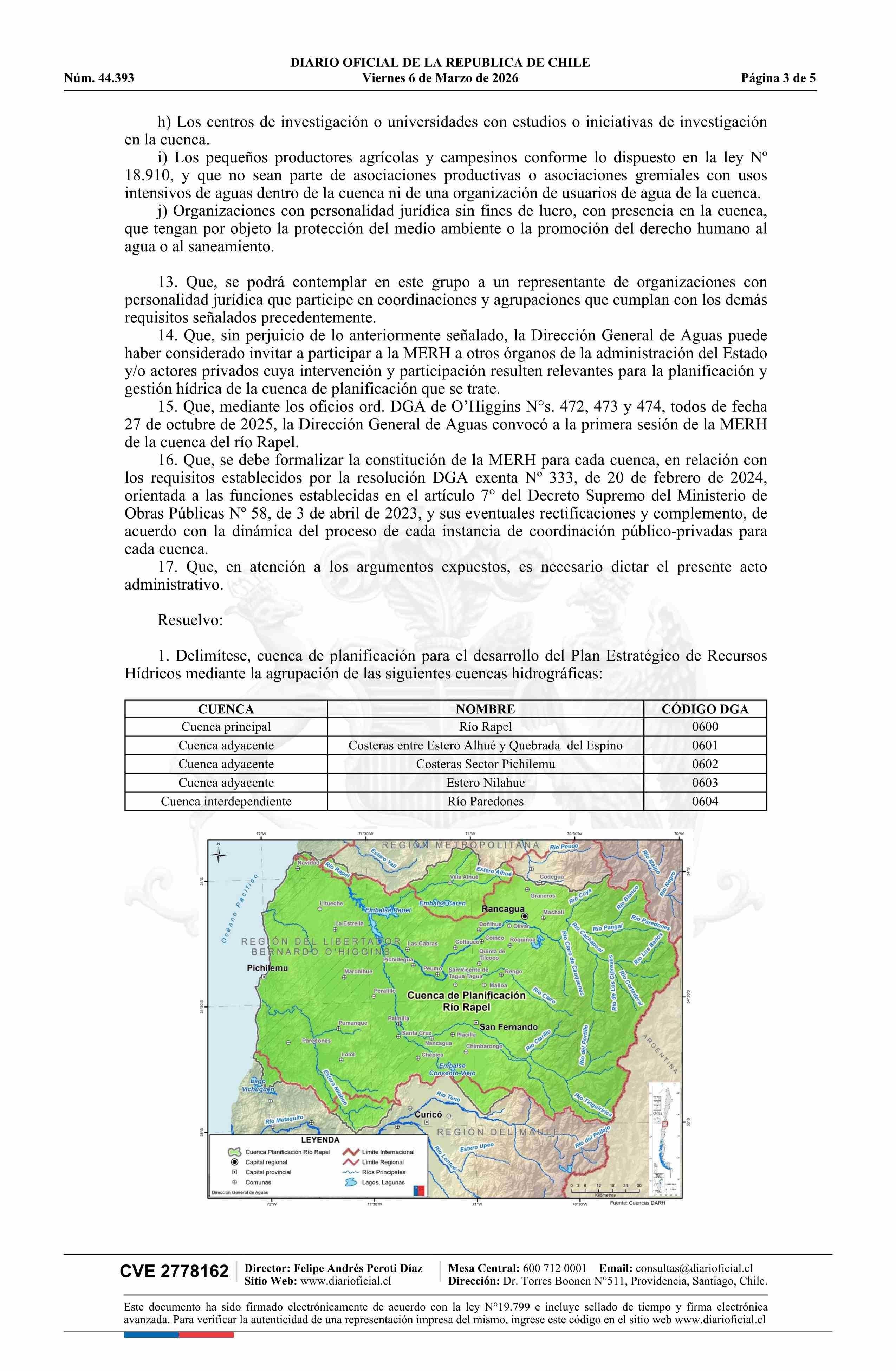 Resolución exenta número 429, de 2026.- Delimita y denomina cuenca de planificación para el desarrollo del Plan Estratégico de Recursos Hídricos en la Cuenca del Río Rapel, Adyacentes e Interdependientes; constituye mesa estratégica de recursos hídricos; identifica convocados y asistencia a primera