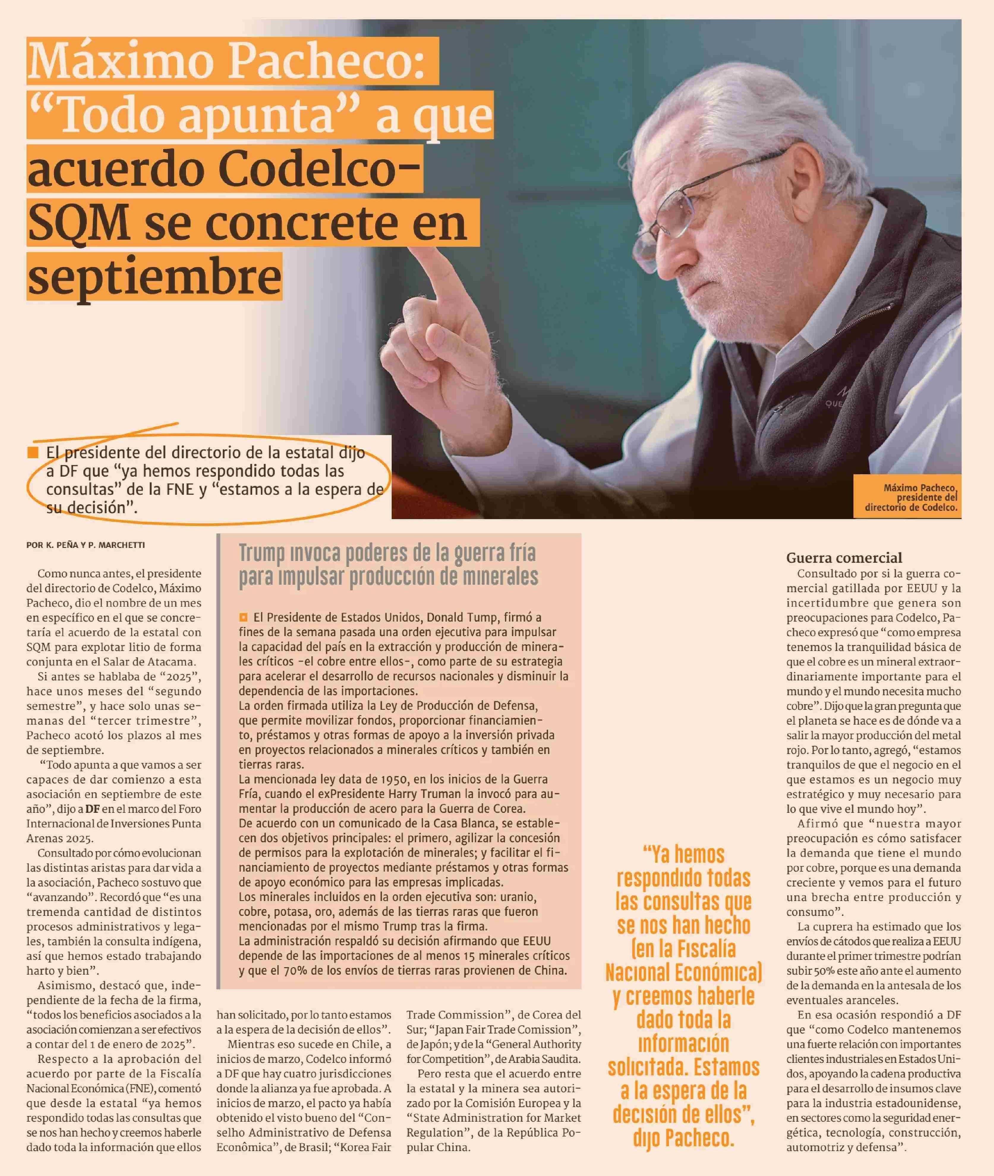 Máximo Pacheco: "Todo apunta" a que acuerdo Codelco- SQM se concrete en septiembre 25-03-2025 Diario Financiero |