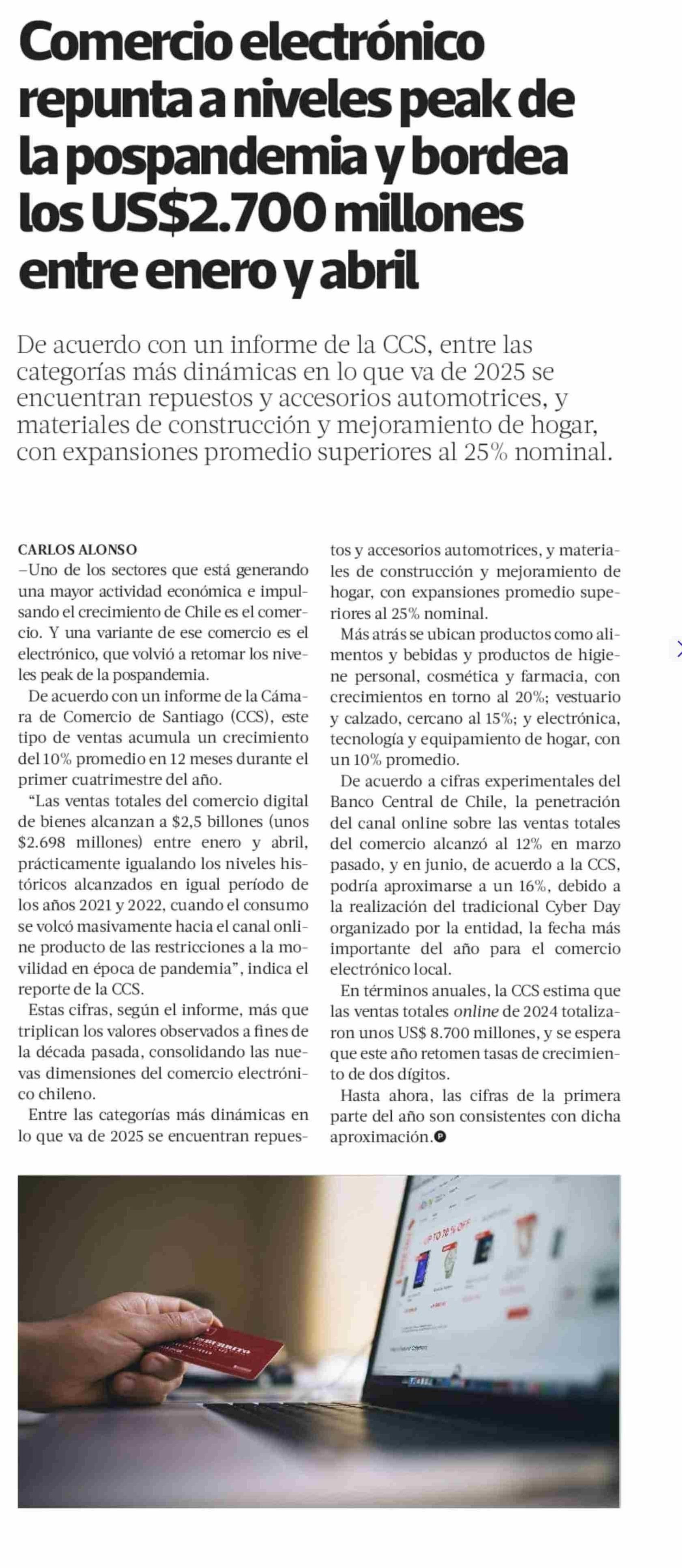 Comercio electrónico repunta a niveles peak de la pospandemia y bordea los US$2.700 millones entre enero y abril 05-06-2025 La Tercera |