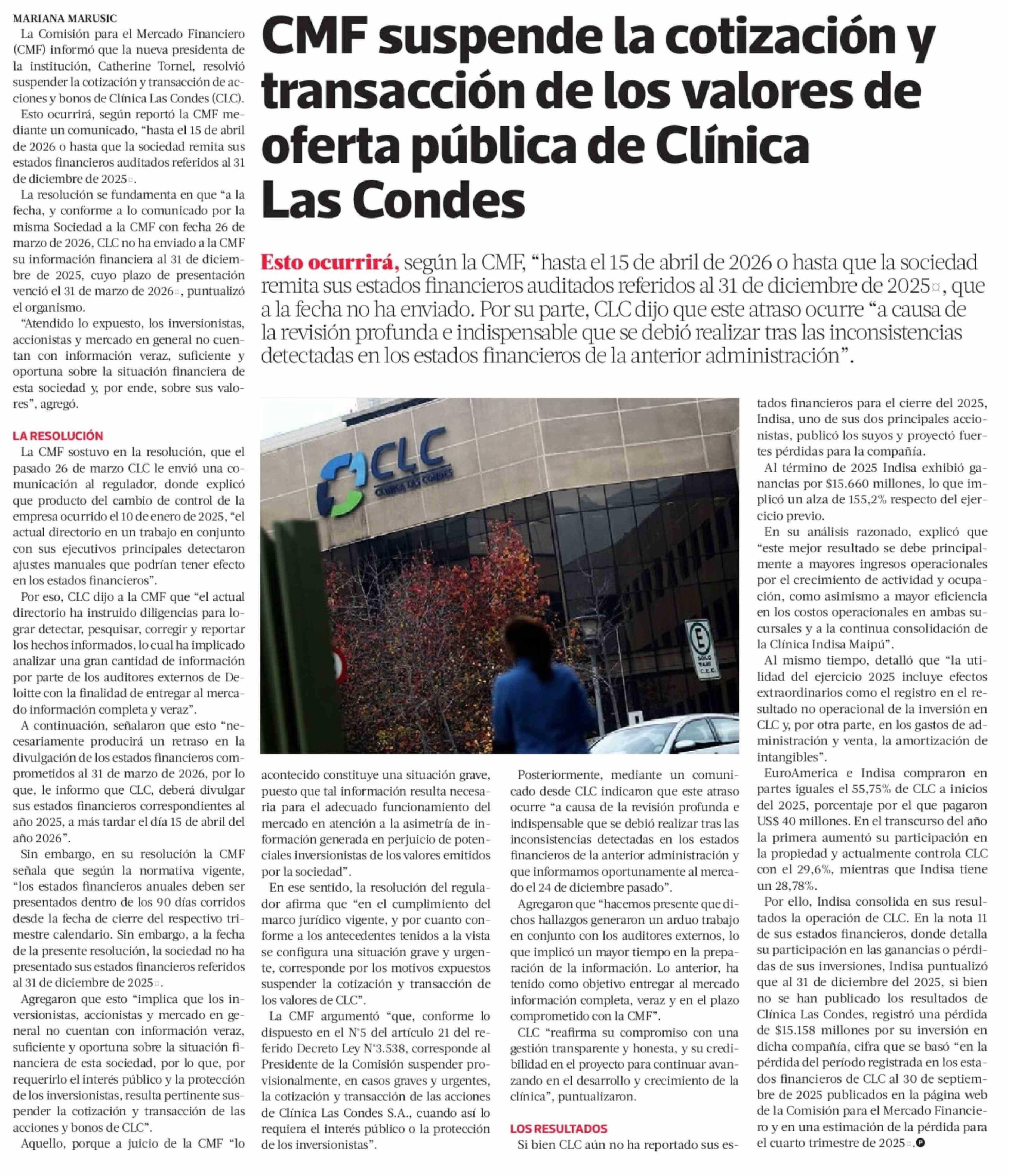 CMF suspende la cotización y transacción de los valores de oferta pública de Clínica Las Condes 02-04-2026 La Tercera |