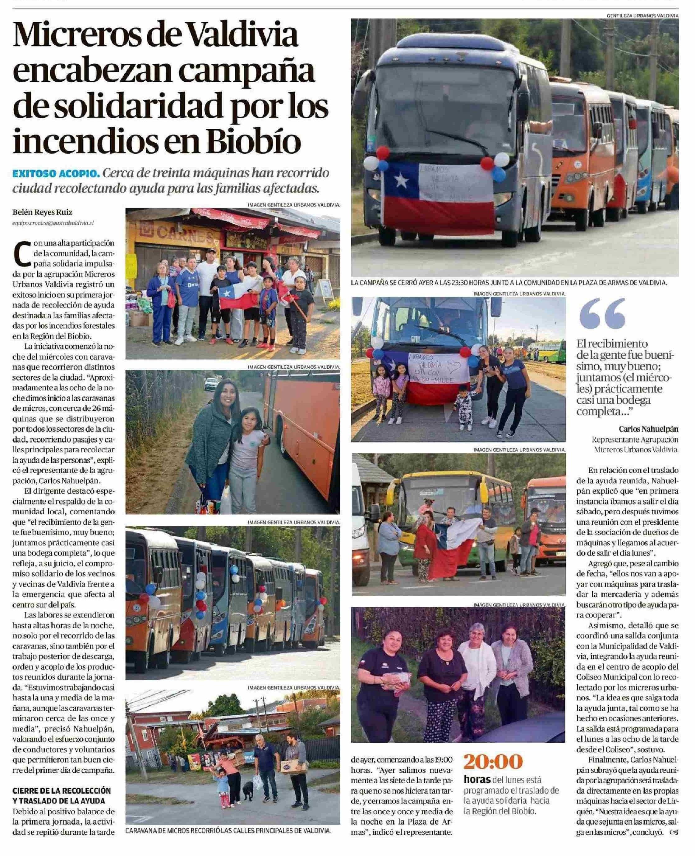 Micreros de Valdivia encabezan campaña de solidaridad por los incendios en Biobío 23-01-2026 Diario Austral Región de Los Ríos |