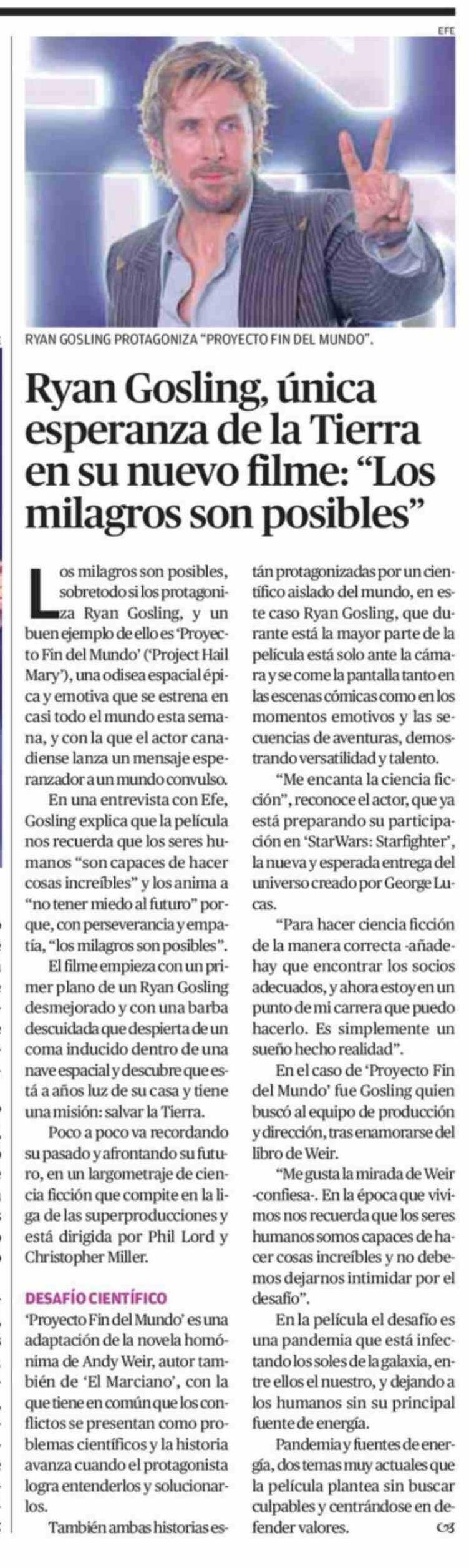 Título: Ryan Gosling, única esperanza de la Tierra en su nuevo filme: "Los milagros son posibles"