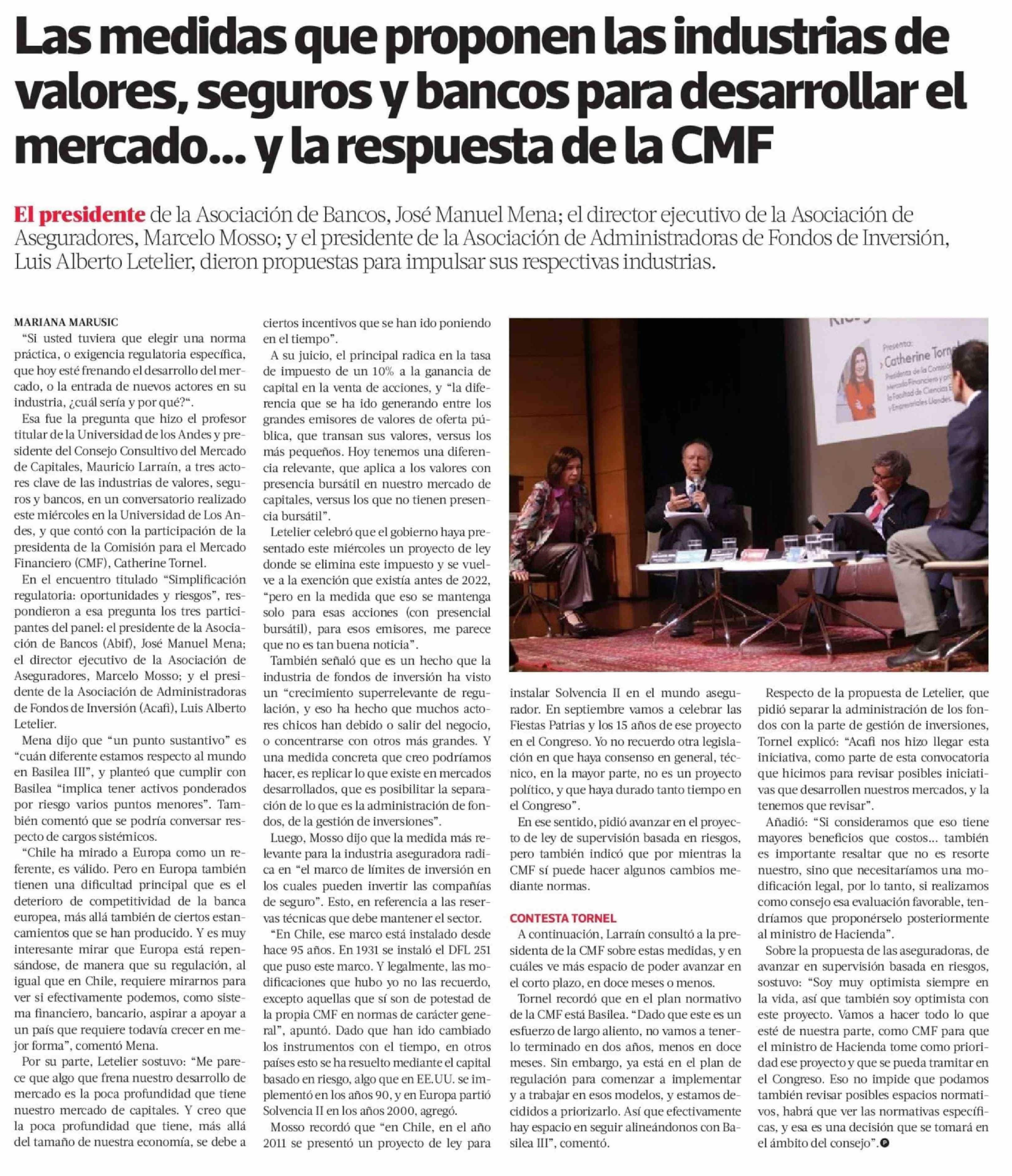 Las medidas que proponen las industrias de valores, seguros y bancos para desarrollar el mercado ... y la respuesta de la CMF 23-04-2026 La Tercera |