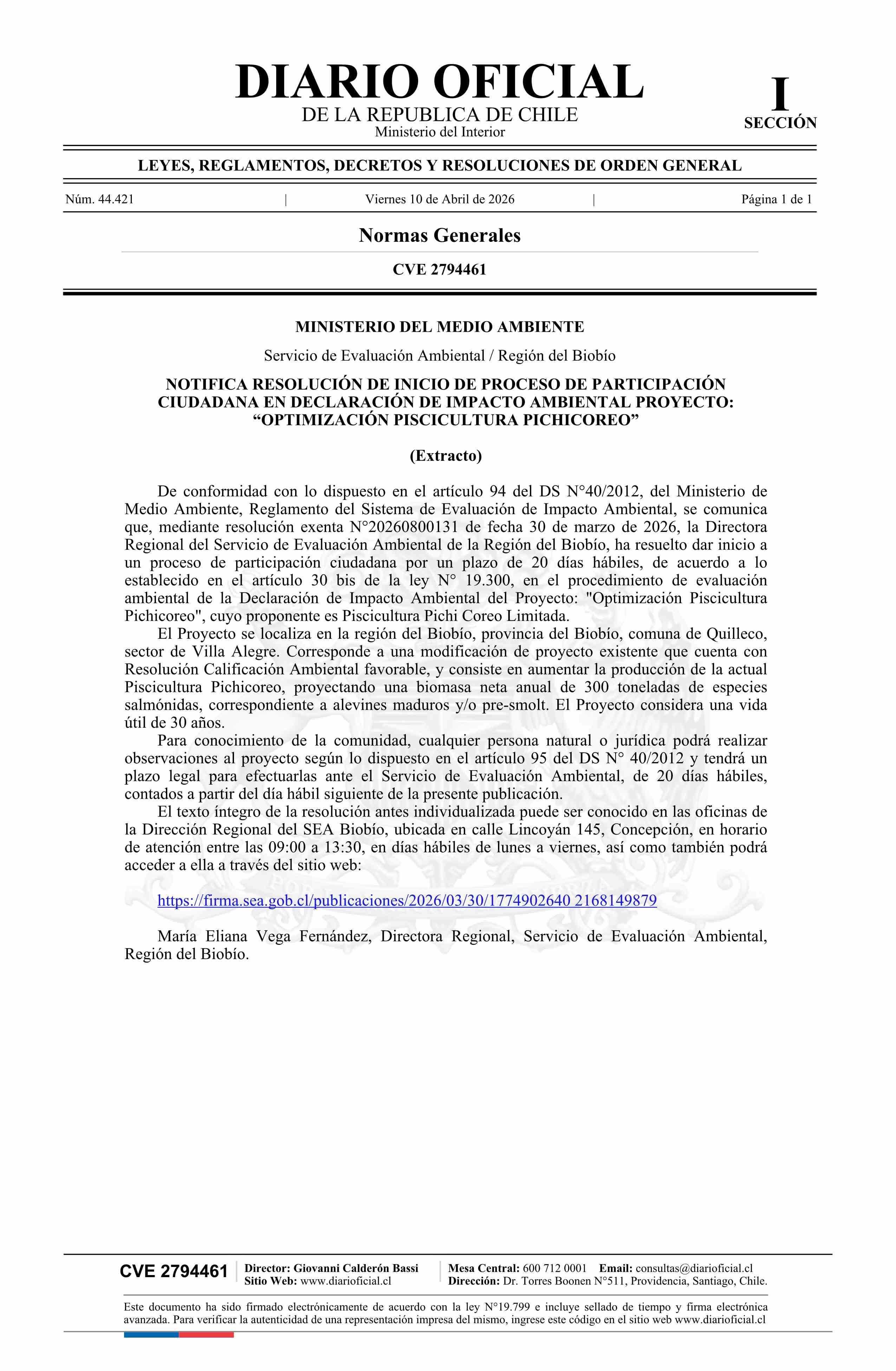 Título: Extracto de resolución exenta número 20260800131, de 2026.- Inicia proceso de participación ciudadana en Declaración de Impacto Ambiental del proyecto Optimización Piscicultura Pichicoreo