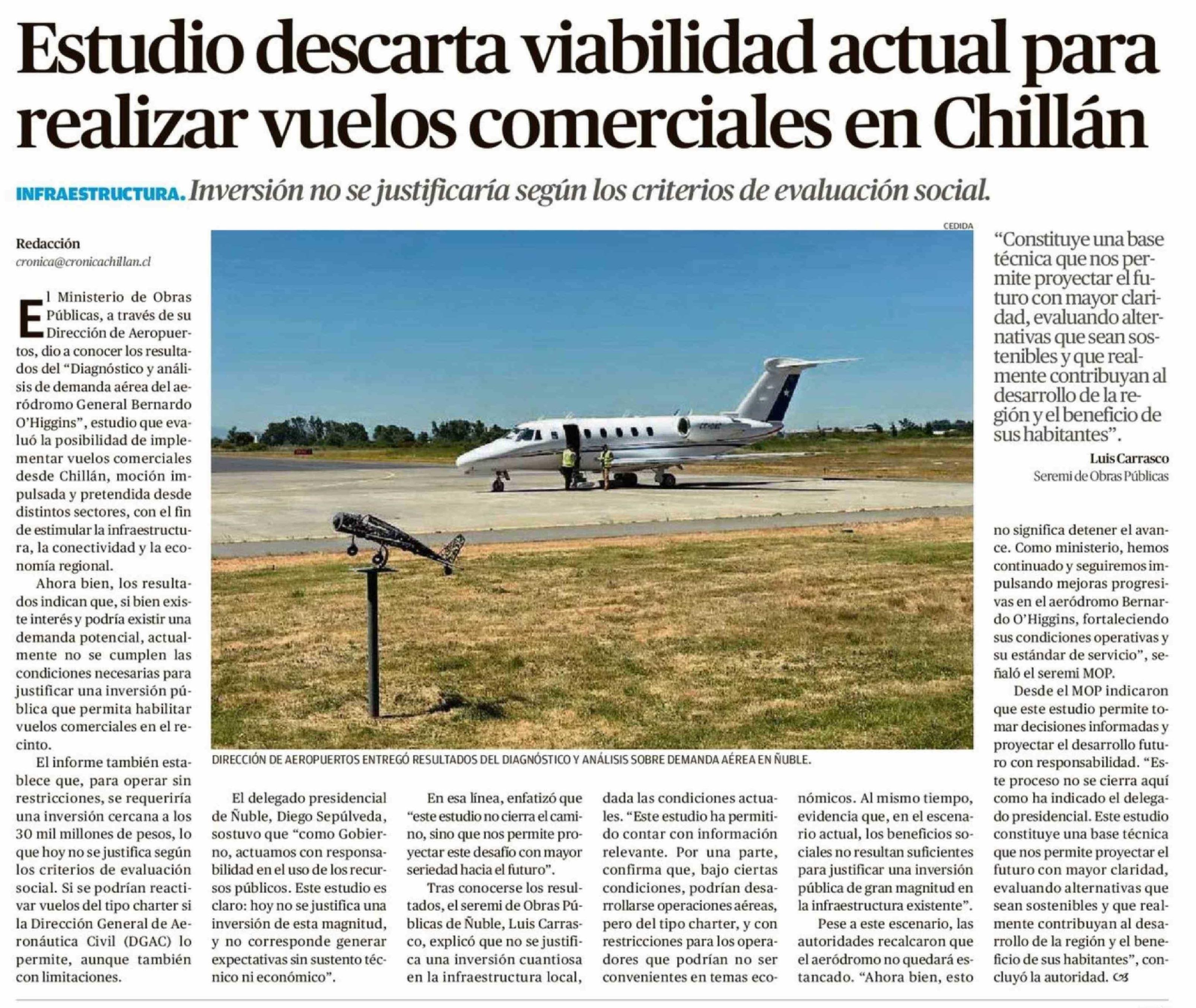 | Título: | Estudio descarta viabilidad actual para realizar vuelos comerciales en Chillán |