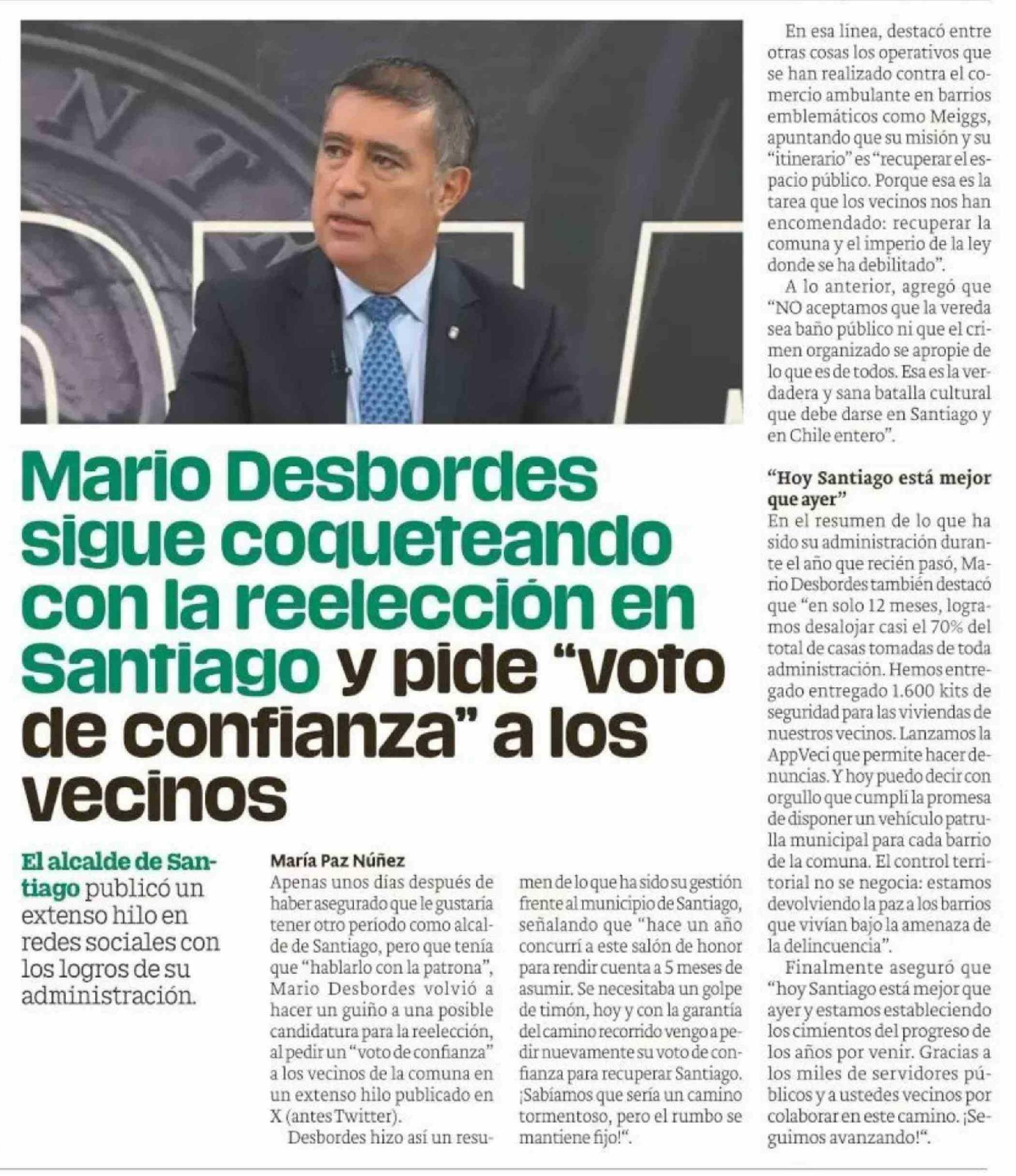| Título: | Mario Desbordes sigue coqueteando con la reelección en Santiago y pide "voto de confianza" a los vecinos |