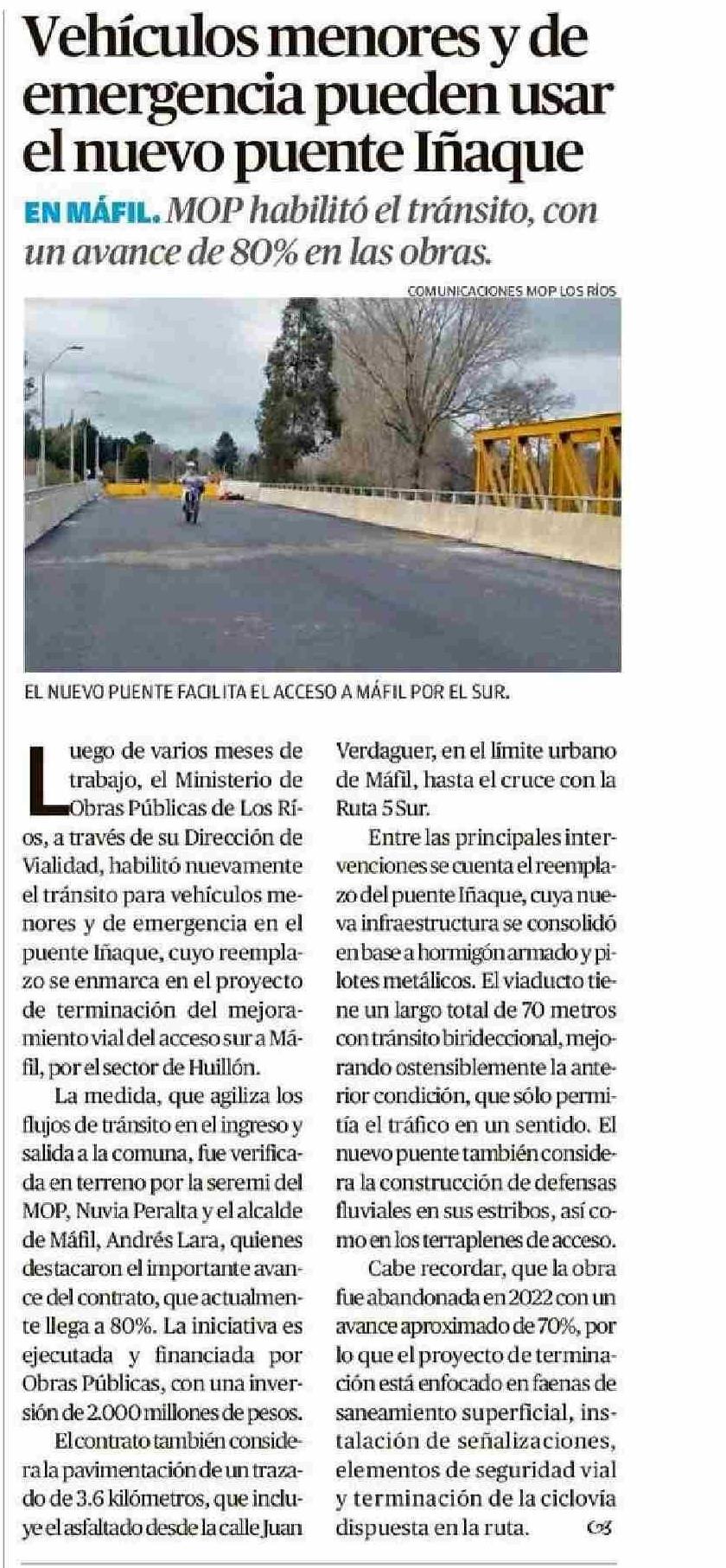 Vehículos menores y de emergencia pueden usar el nuevo puente Iñaque 17-06-2025 Diario Austral Región de Los Ríos |
