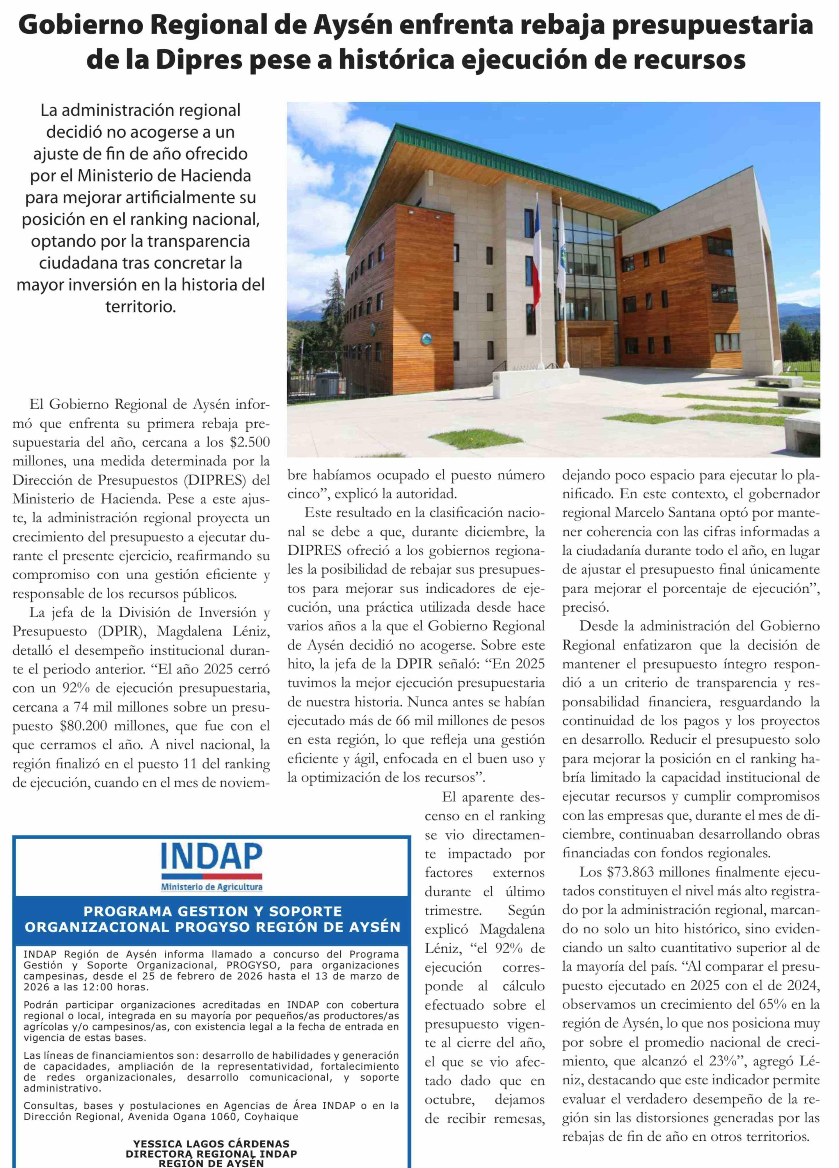 | Título: | Gobierno Regional de Aysén enfrenta rebaja presupuestaria de la Dipres pese a histórica ejecución de recursos |