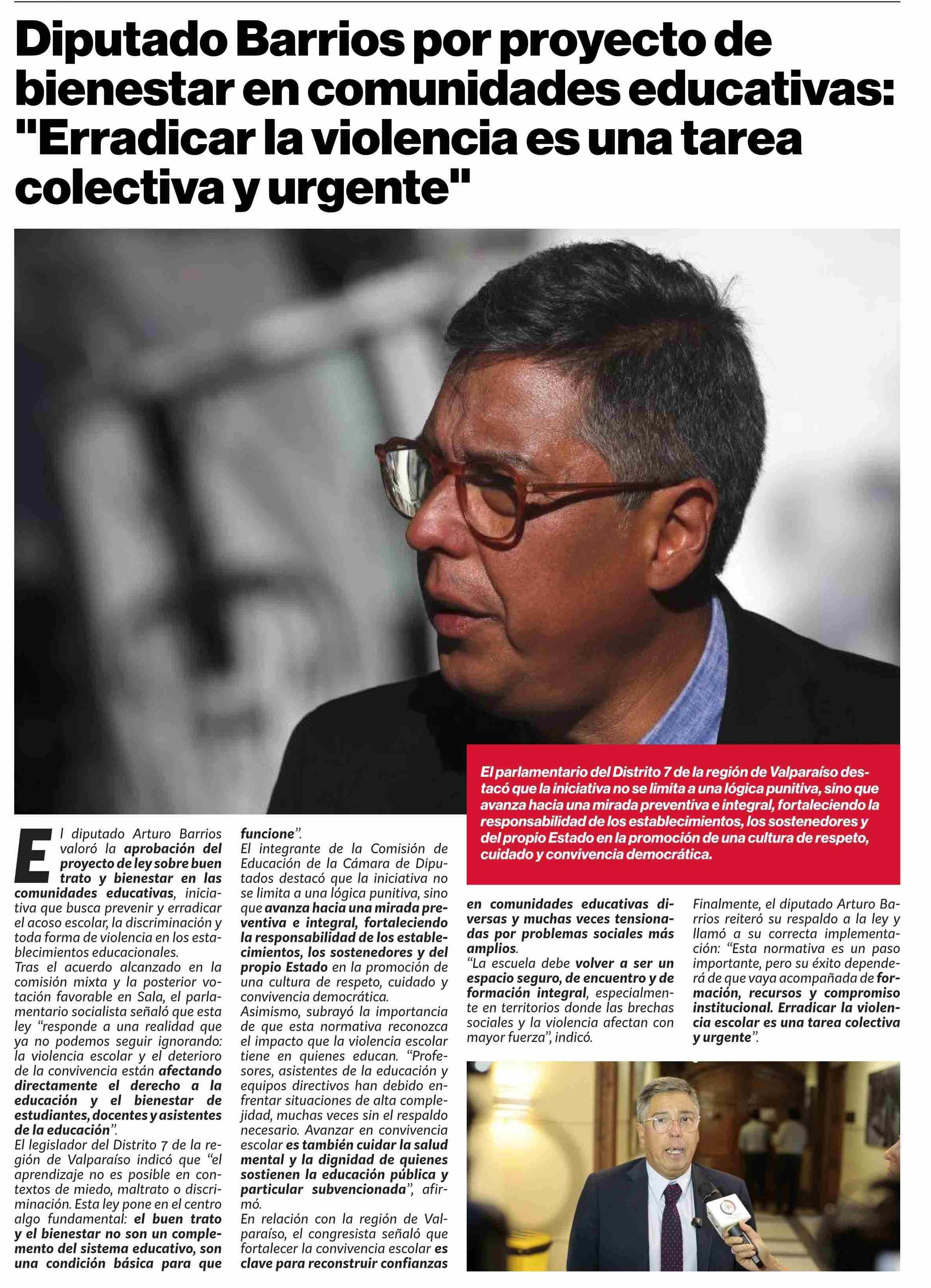Título: Diputado Barrios por proyecto de bienestar en comunidades educativas: "Erradicar la violencia es una tarea colectiva y urgente”