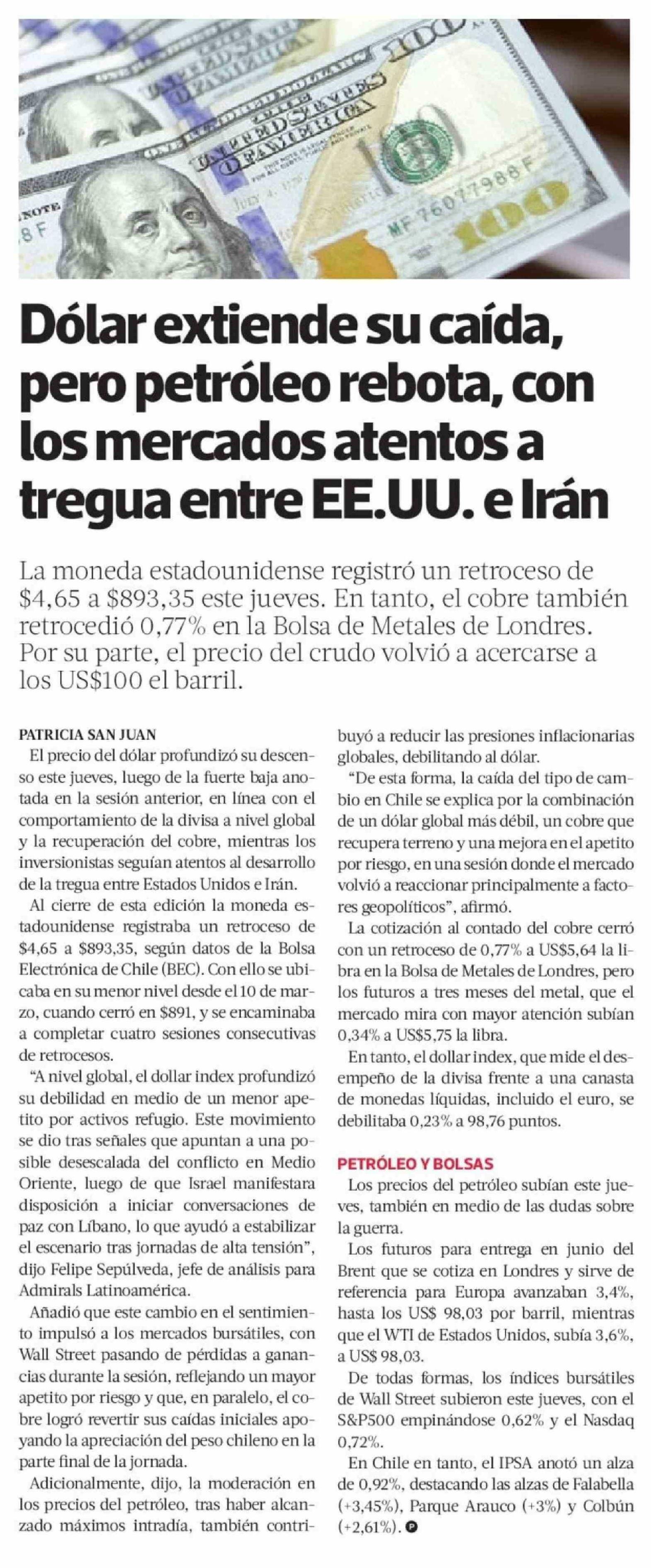 Dólar extiende su caída, pero petróleo rebota, con los mercados atentos a tregua entre EE.UU. e Irán 10-04-2026 La Tercera |