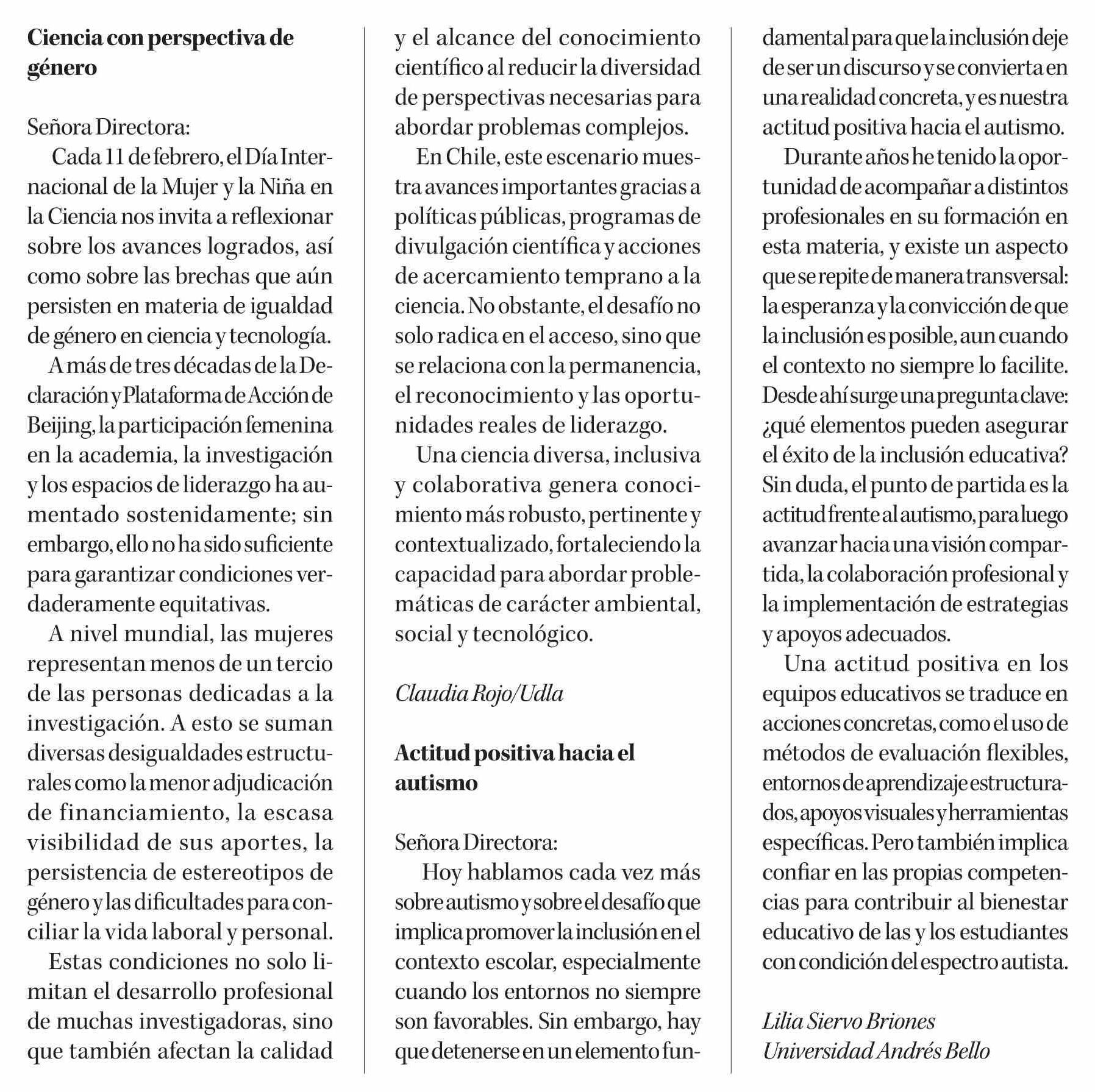 | Título: | Señora Directora: Cada 11 de febrero, el Día Internacional de la Mujer y la Niña en la Ciencia nos invita a reflexionar sobre los avances logrados, así como sobre las brechas que aún persisten en materia de igualdad de género en ciencia y tecnología. A más de tres décadas de la Declaración y Platafo |