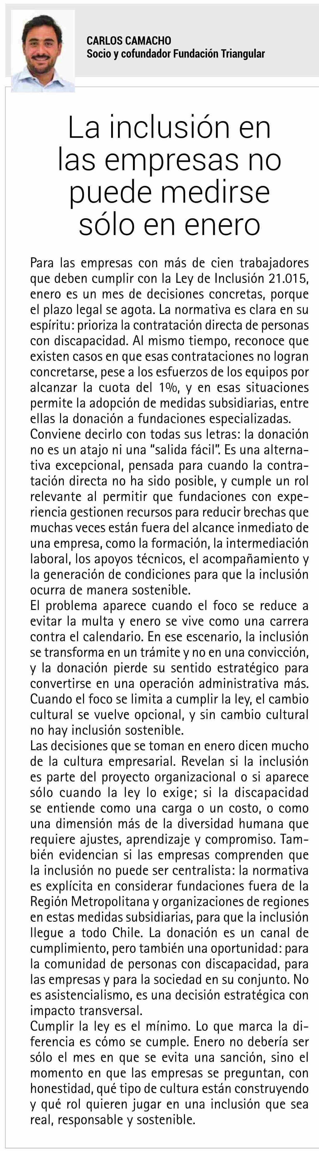 Columnas de Opinión: La inclusión en las empresas no puede medirse sólo en enero 13-01-2026 El Rancagüino |