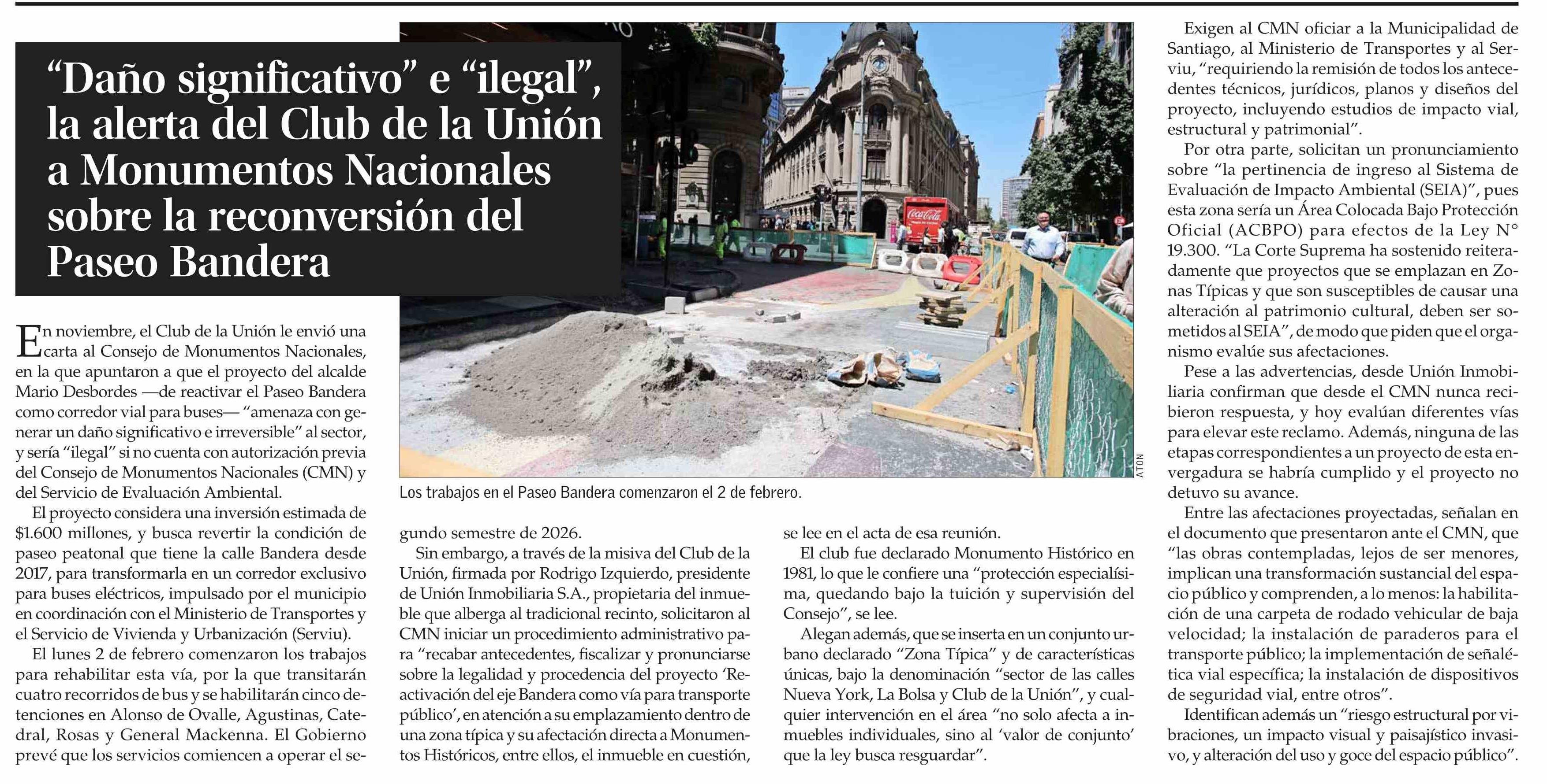 "Daño significativo" e "ilegal", la alerta del Club de La Unión a Monumentos Nacionales sobre reconversión del Paseo Bandera 22-02-2026 El Mercurio |