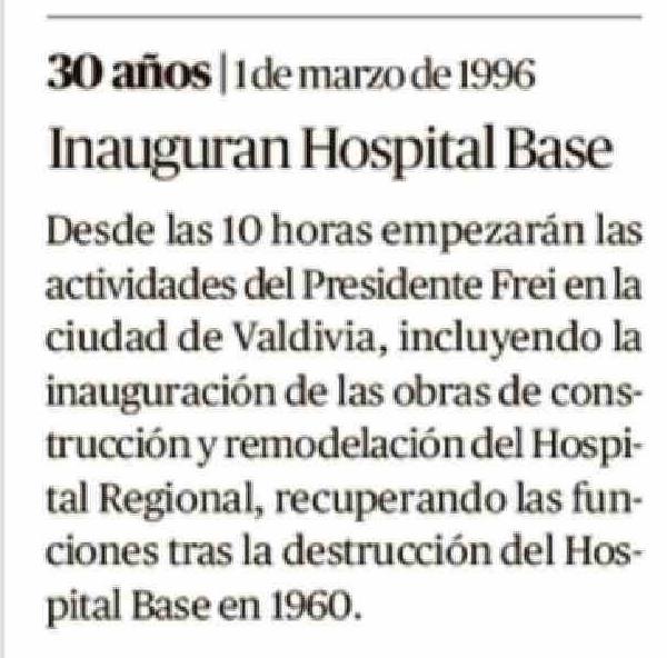 Título: 30 años | 1 de marzo de 1996 Inauguran Hospital Base Desde las 10 horas empezarán las actividades del Presidente Frei en la ciudad de Valdivia, incluyendo la inauguración de las obras de construcción y remodelación del Hospital Regional, recuperando las funciones tras la destrucción del Hospital Bas